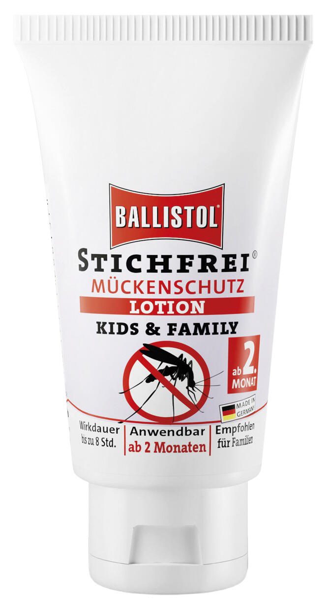 Hinweis: Besonders bei Kleinstkindern ist zu beachten, dass manche Substanzen gefährlich sein können und diese bei Produkten vermieden werden sollten: »» Lösungsmittel, Alkohole und kühlend wirkende Substanzen wie Minze und Menthol, können schnell zu einer Unterkühlung führen. Dies kann die Bluthirnschranke unterbrechen, was wiederum zu Halluzinationen führen kann. Ebenso verursachen diese Bestandteile starkes Brennen in Augen und Schleimhäuten. »» Ätherische Öle können bei Babys allergenes Potential haben und eine Atemblockade auslösen. »» Konservierungsstoffe können dermatologisch bedenklich sein. »» DEET ist im Verdacht gesundheitlich bedenklich zu wirken. (DEET wird in keinem Produkt von BALLISTOL verwendet!) Aus diesem Grund verwenden wir in Stichfrei Kids das Repellent IR 3535 (Ethylbutylacetylaminopropionat) das auch von der WHO (Weltgesundheitsorganisation) und vom französischen Gesundheitsministerium für Kinder ab 2 Monaten und Schwangere empfohlen wurde (Quelle: Internet, während der Chinkungunya Fälle 2005/2006). Auf zusätzliche Stoffe wurde aus oben genannten Gründen verzichtet, um die sensible Baby- und Kinderhaut zu schonen und keine Komplikationen hervorzurufen. Durch das Auftragen als Lotion, die sehr schnell einzieht wird ein unbeabsichtigtes Verreiben in die Augen und Schleimhäute vermieden.