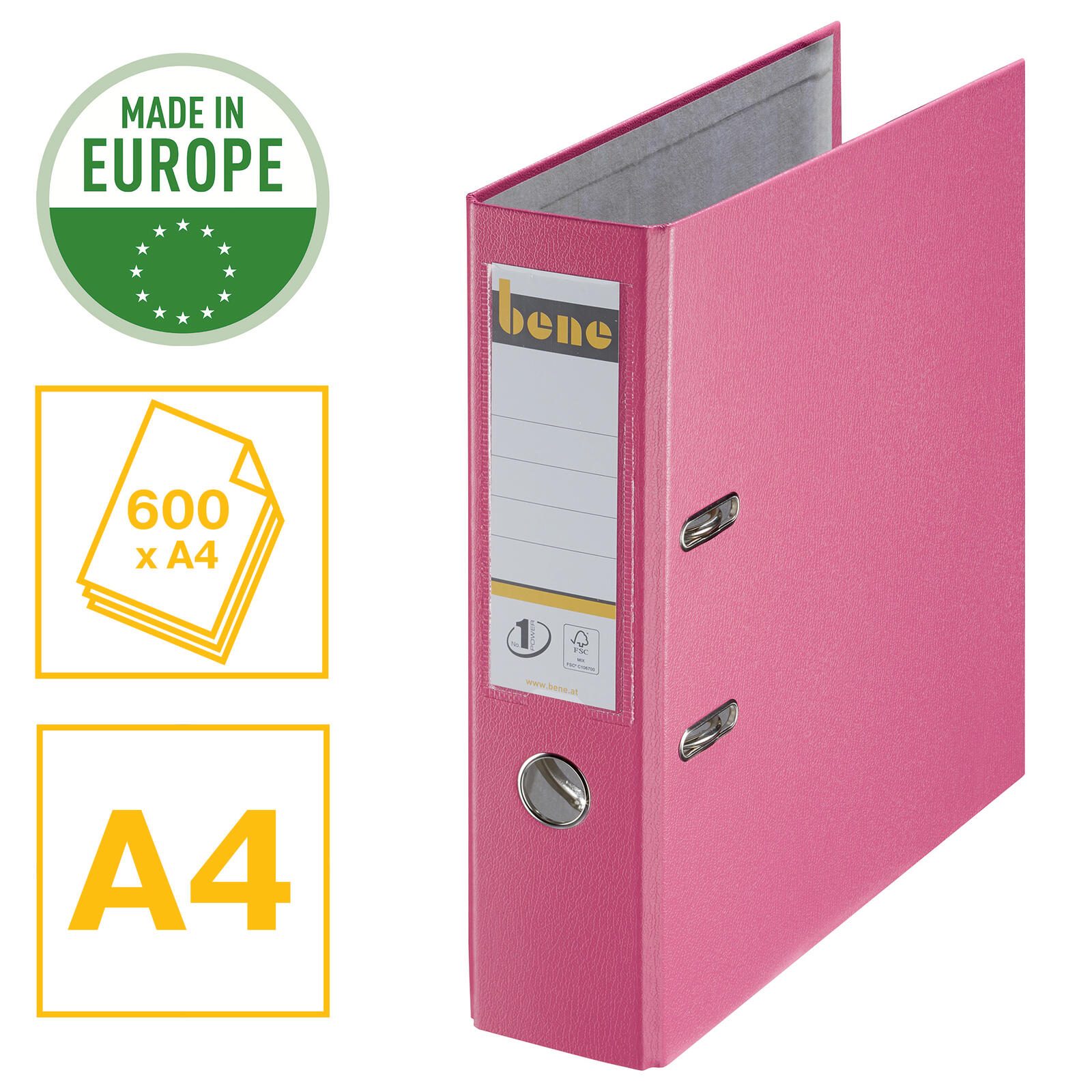 Der bene Ordner mit der Rückenbreite von 8,0 cm ist speziell für Dokumente im Format DIN A4 konzipiert. Er besteht aus robustem Kunststoff, der eine langlebige und widerstandsfähige Nutzung gewährleistet. Die Oberfläche ist sowohl innen als auch außen aus dem gleichen Material gefertigt, was eine einheitliche Optik und Pflegeleichtigkeit bietet. Die Farbe des Ordners ist ein dezentes Rosa, das dem Produkt eine klare und ansprechende Erscheinung verleiht.