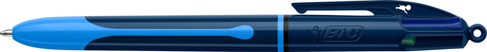 Der BIC® 4-Farben-Kugelschreiber ist ein praktischer Schreibstift, der vier verschiedene Schreibfarben in einem Gehäuse vereint: schwarz, blau, rot und grün. Das Gehäuse ist in einem klaren blau/hellblau gehalten und verfügt über eine runde Griffart, die für eine angenehme Handhabung sorgt. Mit einer Strichstärke von 0,4 mm ermöglicht der Kugelschreiber präzise und gut lesbare Schriftzüge.