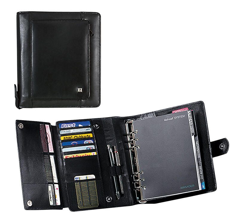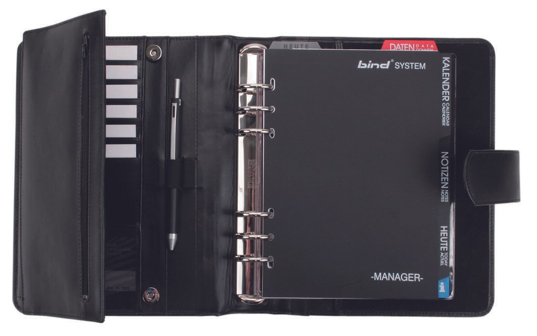 Der Bind Terminplaner Bind Managerplaner A5 Mv O.Kal in elegantem Schwarz ist aus hochwertigem Nappaleder gefertigt. Dieser Terminplaner wird inklusive vieler nützlicher Elemente geliefert, darunter ein Deckblatt, einen Übersichtskalender, Register A-Z, Notizblätter, karierte Infoseiten, Berichte, Blätter für tägliche Aufzeichnungen, Adressseiten, Datenübersichten und Finanzblätter.