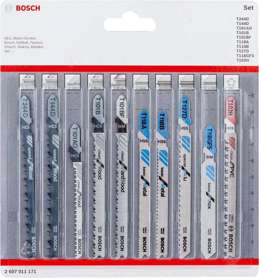 Die Sägeblätter sind einfach zu handhaben und passen auf die meisten handelsüblichen Stichsägen. Das macht das Set zu einem praktischen Begleiter für vielfältige Anwendungen in Werkstatt und Haushalt. Vertrauen Sie auf die bewährte Qualität von BOSCH und profitieren Sie von einem vielseitigen, langlebigen und leistungsstarken Stichsägeblätter-Set.