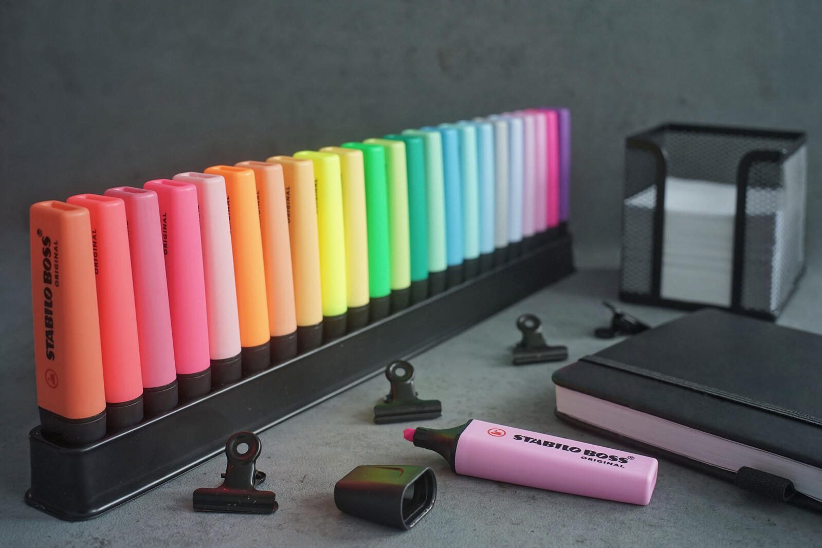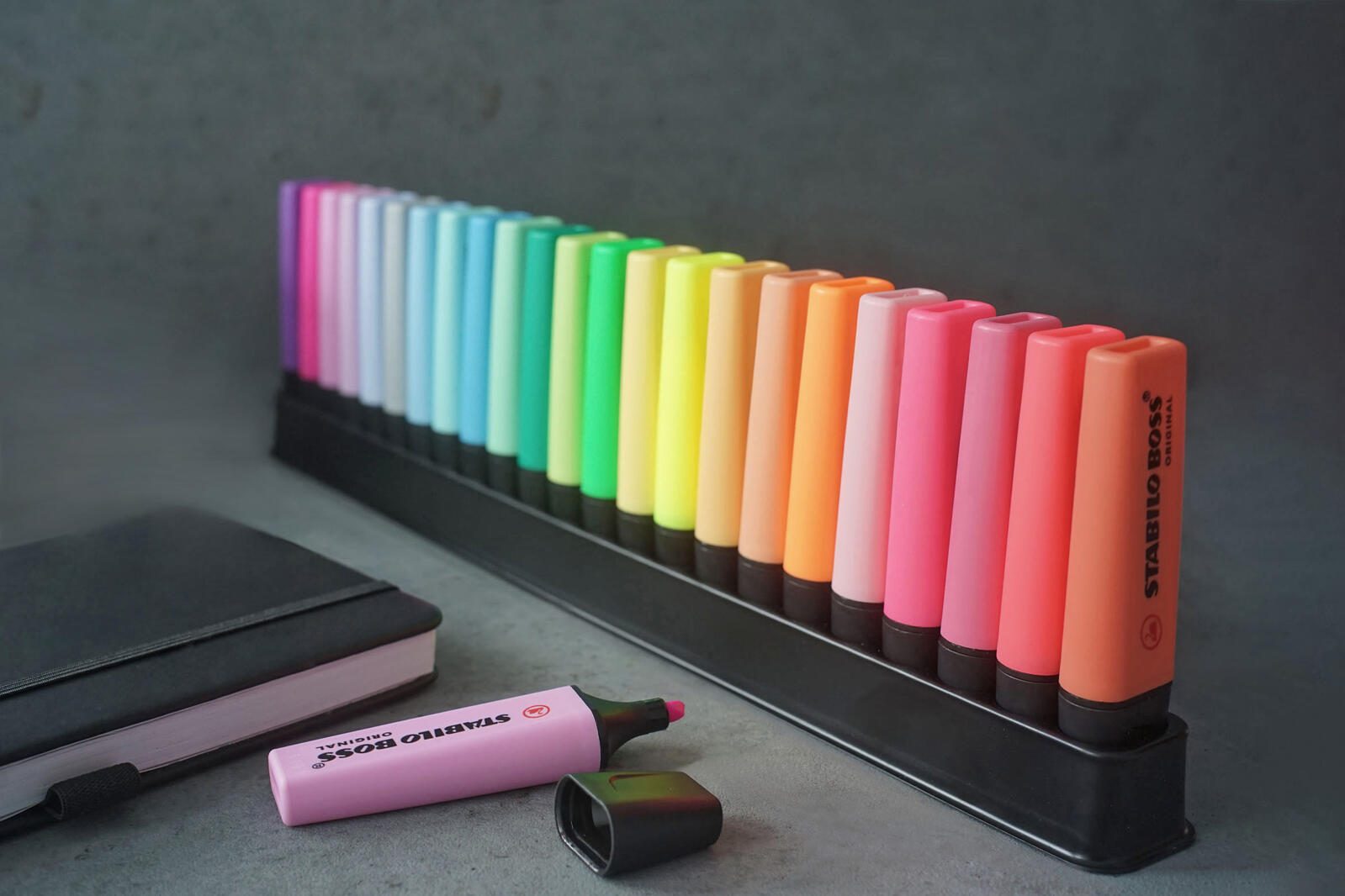 - Besonderheiten: limitiertes Tischset zum 50. Geburtstag, alle 23 Farben des STABILO® BOSS® ORIGINAL in einem Set, davon 9 Leuchtfarben und 14 Pastellfarben