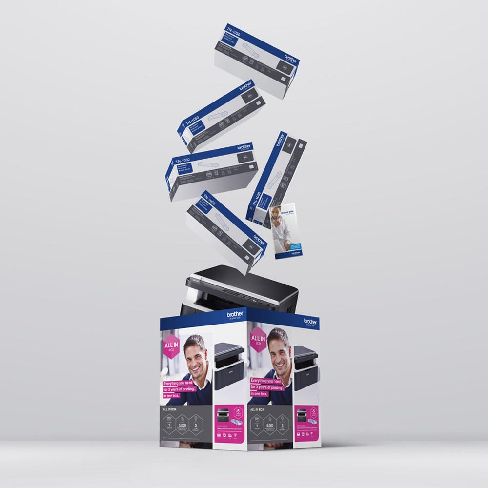 5 x Cartridge (Schwarz) - bis zu 1000 Seiten ISO/IEC 19752 - Brother TN1050 ¦ 1 x Trommel - bis zu 10000 Seiten - Brother DR1050
