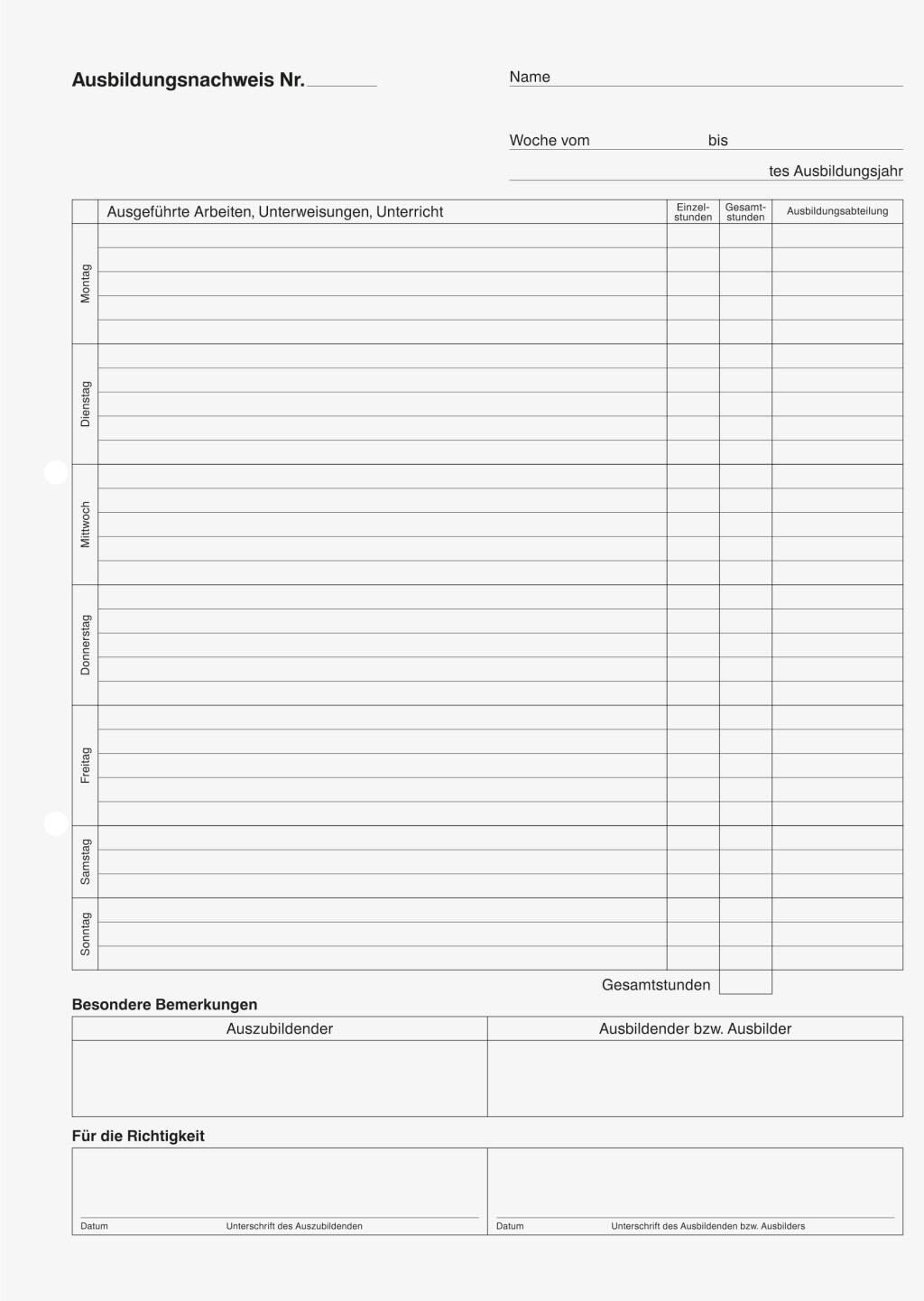 - Formular: Ausbildungsnachweis, tägliche Eintragungen