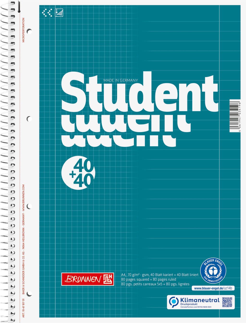 Der BRUNNEN Collegeblock DIN A4 ist der ideale Begleiter für Schule, Studium und Büro. Mit seinen 2x 40 Blatt bietet er ausreichend Platz für Notizen, Skizzen und kreative Ideen. Das hochwertige Papier mit einem Gewicht von 70 g/m² sorgt für ein angenehmes Schreibgefühl und ist zudem holzfrei, was umweltfreundlich ist. Die elementar chlorfreie Bleichung (ECF) garantiert, dass die Blätter nicht nur umweltbewusst, sondern auch von hoher Qualität sind. Die flexible Bindung des Collegeblocks ermöglicht ein einfaches Umblättern und eine komfortable Handhabung, egal ob du im Unterricht oder beim Arbeiten bist. Der grauweiße Farbton des Papiers sorgt für einen optimalen Kontrast beim Schreiben und Lesen, was die Lesbarkeit deiner Notizen erheblich verbessert. Der BRUNNEN Collegeblock ist mit einer 4-fach-Lochung ausgestattet, sodass du die Blätter problemlos in Ordnern abheften kannst. Ein besonderes Merkmal sind die Innen- und Außenränder, die dir helfen, deine Notizen übersichtlich zu gestalten und Platz für Anmerkungen zu lassen. Die Microperforation ermöglicht ein sauberes Abreißen der Blätter, sodass du deine Notizen jederzeit einfach und ordentlich nutzen kannst. Ob für den täglichen Gebrauch in der Schule oder für kreative Projekte, der BRUNNEN Collegeblock DIN A4 vereint Funktionalität und Qualität. Er ist die perfekte Wahl für alle, die Wert auf ein durchdachtes Notizbuch legen. Mit diesem Collegeblock bist du bestens ausgestattet, um deine Gedanken und Ideen festzuhalten.Technische Daten