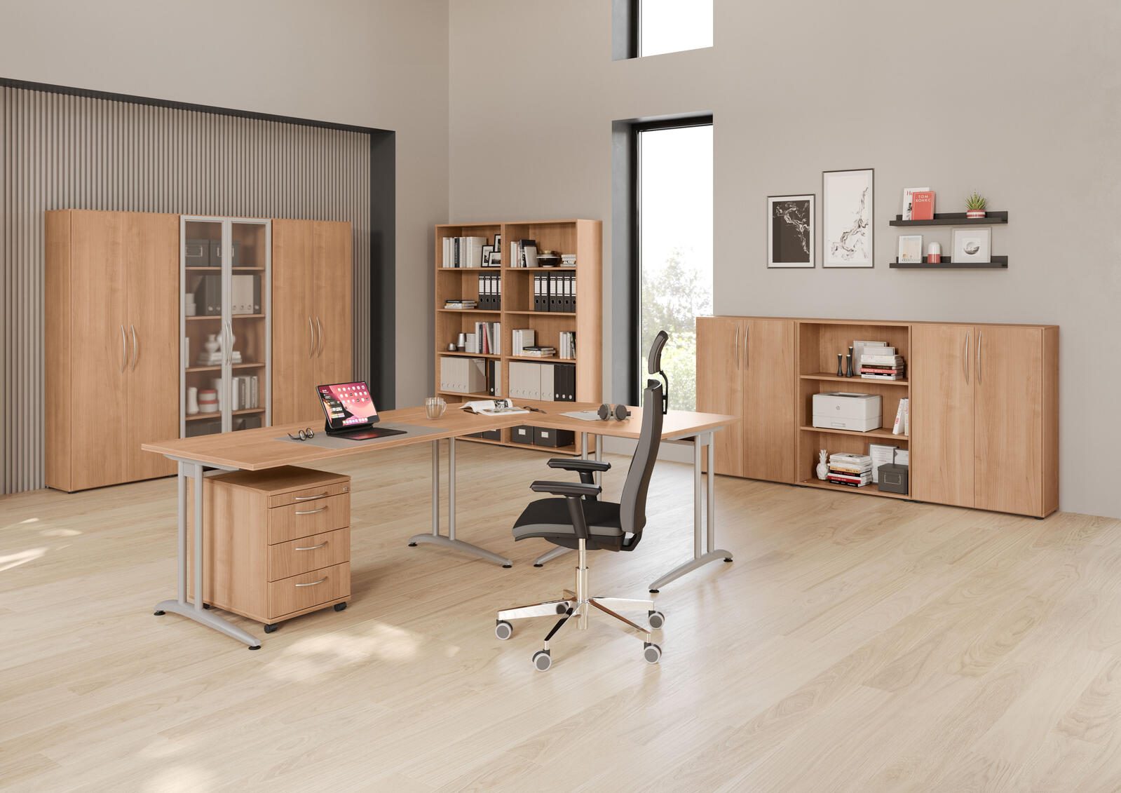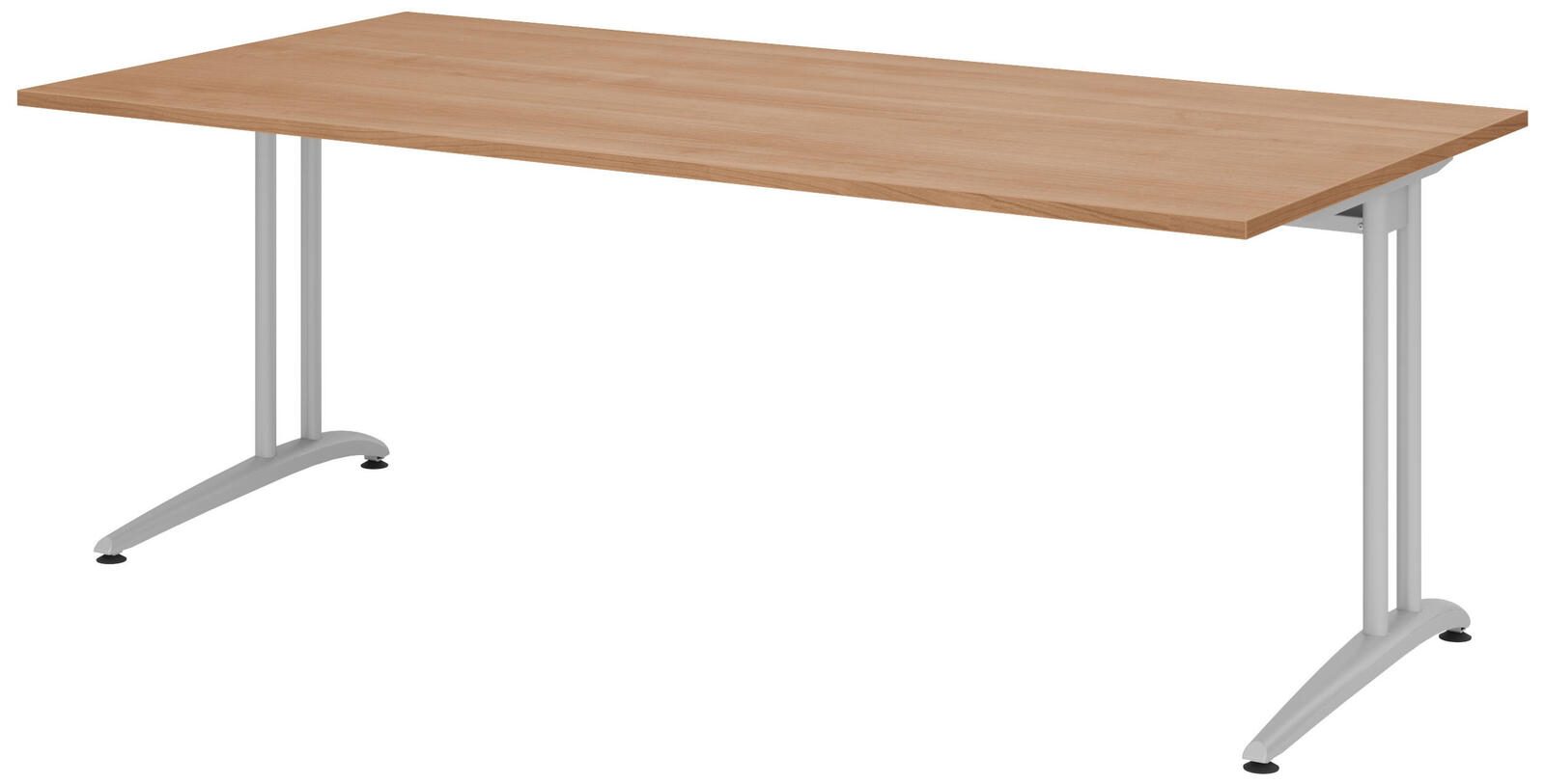 Der HAMMERBACHER Schreibtisch VBS2E/N/S in elegantem Nussbaum-Design vereint Funktionalität und stilvolles Ambiente in Ihrem Arbeitsbereich. Mit einer großzügigen Tischplatte aus robuster Spanplatte bietet dieser Schreibtisch eine ideale Fläche von 200 cm Breite, 100 cm Tiefe und 72 cm Höhe, die ausreichend Platz für Computer, Unterlagen und persönliche Gegenstände schafft. Das stabile Gestell aus hochwertigem Stahl sorgt für eine sichere und langlebige Nutzung. Die silberne Farbgebung des Gestells harmoniert perfekt mit der warmen Nussbaum-Oberfläche und verleiht dem Schreibtisch eine moderne Note. Das C-Fuß-Gestell garantiert nicht nur eine hohe Stabilität, sondern ermöglicht auch eine flexible Nutzung, ohne dass störende Beine im Weg sind. Der Schreibtisch VBS2E/N/S ist ideal für Home-Offices, Büros oder kreative Arbeitsräume. Die schlichte Eleganz und die durchdachte Konstruktion machen ihn zu einem ansprechenden Möbelstück, das sowohl für konzentriertes Arbeiten als auch für entspannte kreative Prozesse geeignet ist. Ob beim Schreiben, Arbeiten oder Planen, dieser Schreibtisch schafft eine angenehme Atmosphäre und fördert Ihre Produktivität. Genießen Sie die Kombination aus zeitgemäßem Design und praktischer Funktionalität mit dem HAMMERBACHER Schreibtisch VBS2E/N/S in Nussbaum.Technische Daten