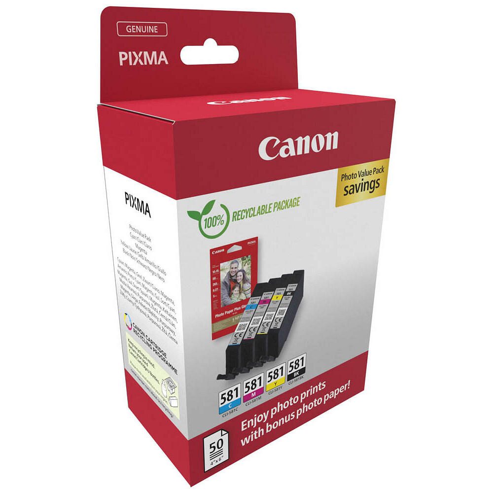 Canon Original CLI-581 Druckerpatronen Value Pack - 1 x schwarz / je 1 x CMY + 50 Blatt Fotopapier (2106C006)