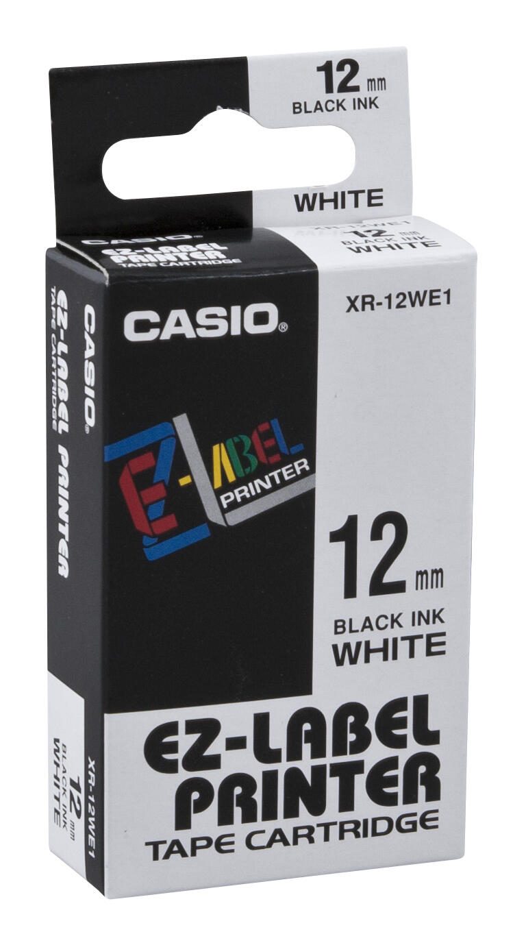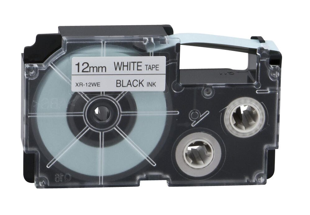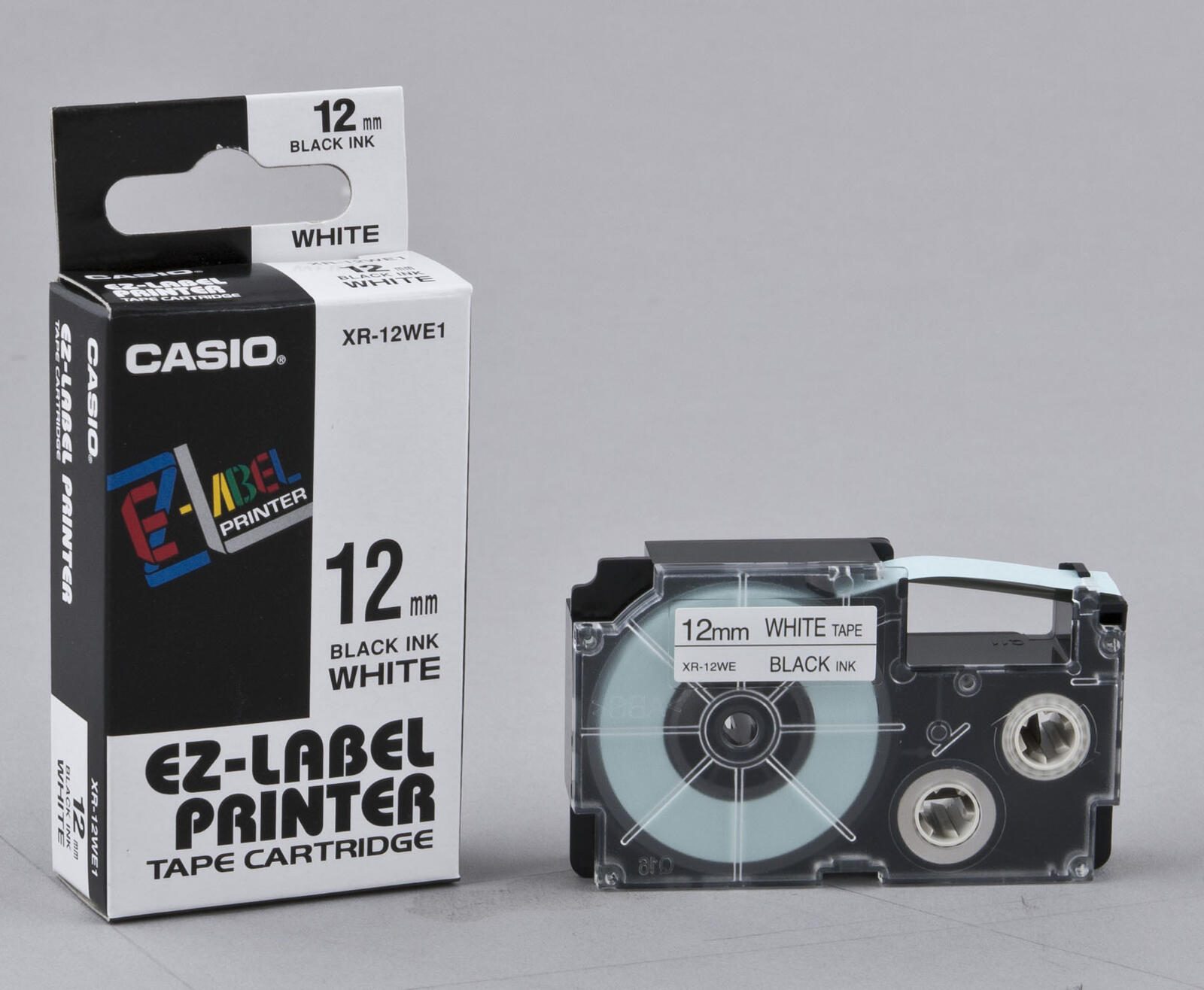 Casio XR-12WE1. Aufkleberfarbe: Schwarz auf weiss. Speicherbandbreite (metrisch): 1,2 cm, Bandlänge: 8 m, Menge pro Packung: 1 Stück(e)