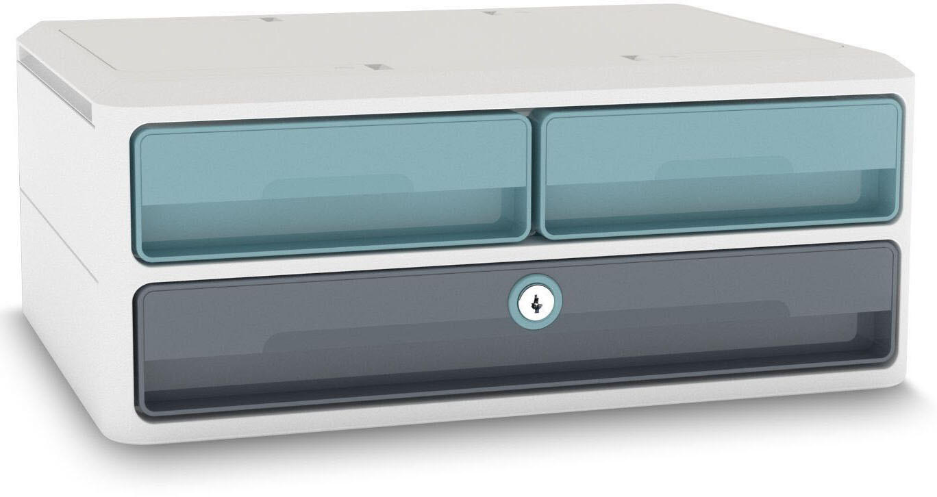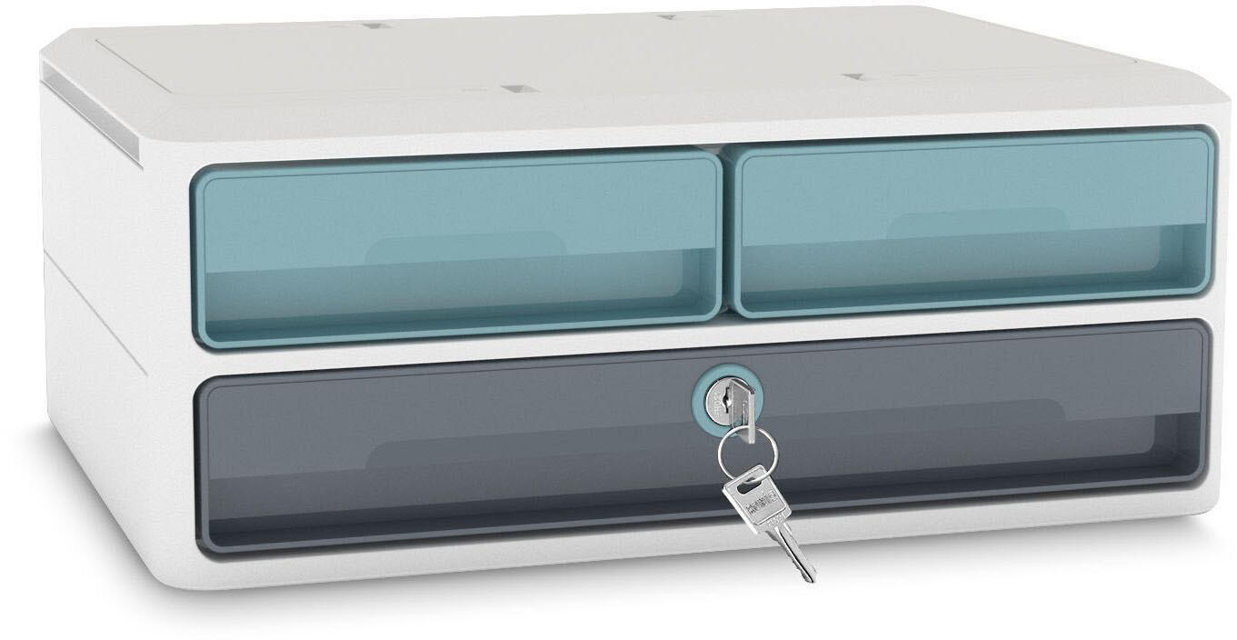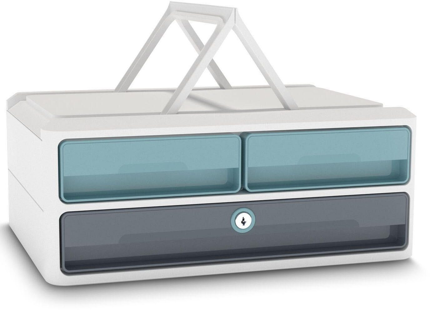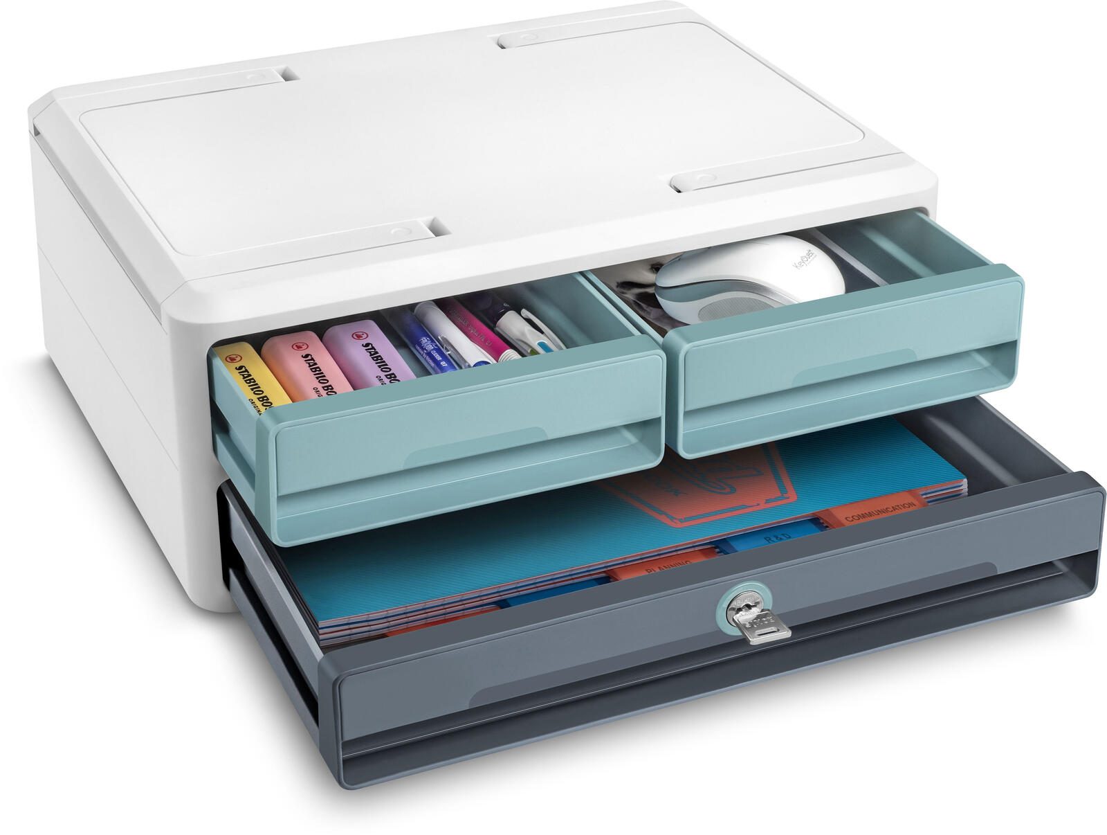 Die cep Schubladenbox 1091212961 ist die perfekte Lösung für die Organisation deiner Unterlagen und Büromaterialien. Mit ihren kompakten Maßen von 37,0 x 27,5 x 14,6 cm passt sie problemlos in jedes Regal oder auf deinen Schreibtisch. Diese Schubladenbox überzeugt nicht nur durch ihr funktionales Design, sondern auch durch ihre ansprechenden Farben in mint und grau, die deinem Arbeitsplatz einen frischen Akzent verleihen. Ein besonderes Highlight der cep Schubladenbox ist die Ausführung mit Tragegriff und Schloss, die es dir ermöglicht, alle drei Schubladen sicher zu verriegeln. So kannst du deine wertvollen Dokumente und Utensilien jederzeit geschützt aufbewahren. Das Material, aus dem die Box gefertigt ist, besteht aus recycelbarem Polystyrol, was nicht nur umweltfreundlich ist, sondern auch für eine hohe Langlebigkeit sorgt. Die Schubladenbox ist stapelbar, was dir zusätzliche Flexibilität bei der Anordnung deiner Arbeitsmaterialien bietet. Du kannst mehrere Boxen übereinanderstapeln, um Platz zu sparen und gleichzeitig den Überblick zu behalten. Die durchdachte Konstruktion und die praktischen Funktionen machen die cep Schubladenbox zu einem unverzichtbaren Begleiter in jedem Büro oder Home Office. Die Kombination aus Funktionalität, ansprechendem Design und umweltfreundlichem Material macht die cep Schubladenbox 1091212961 zu einer idealen Wahl für jeden, der Wert auf Ordnung und Stil legt.Technische Daten