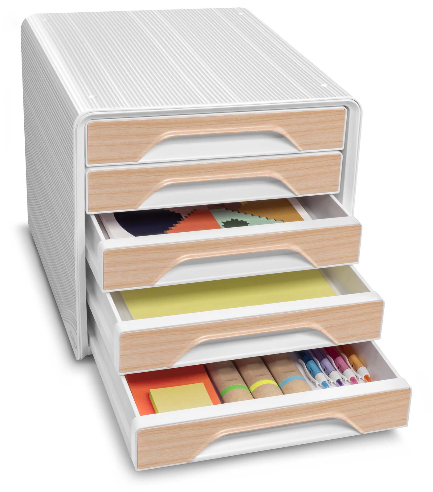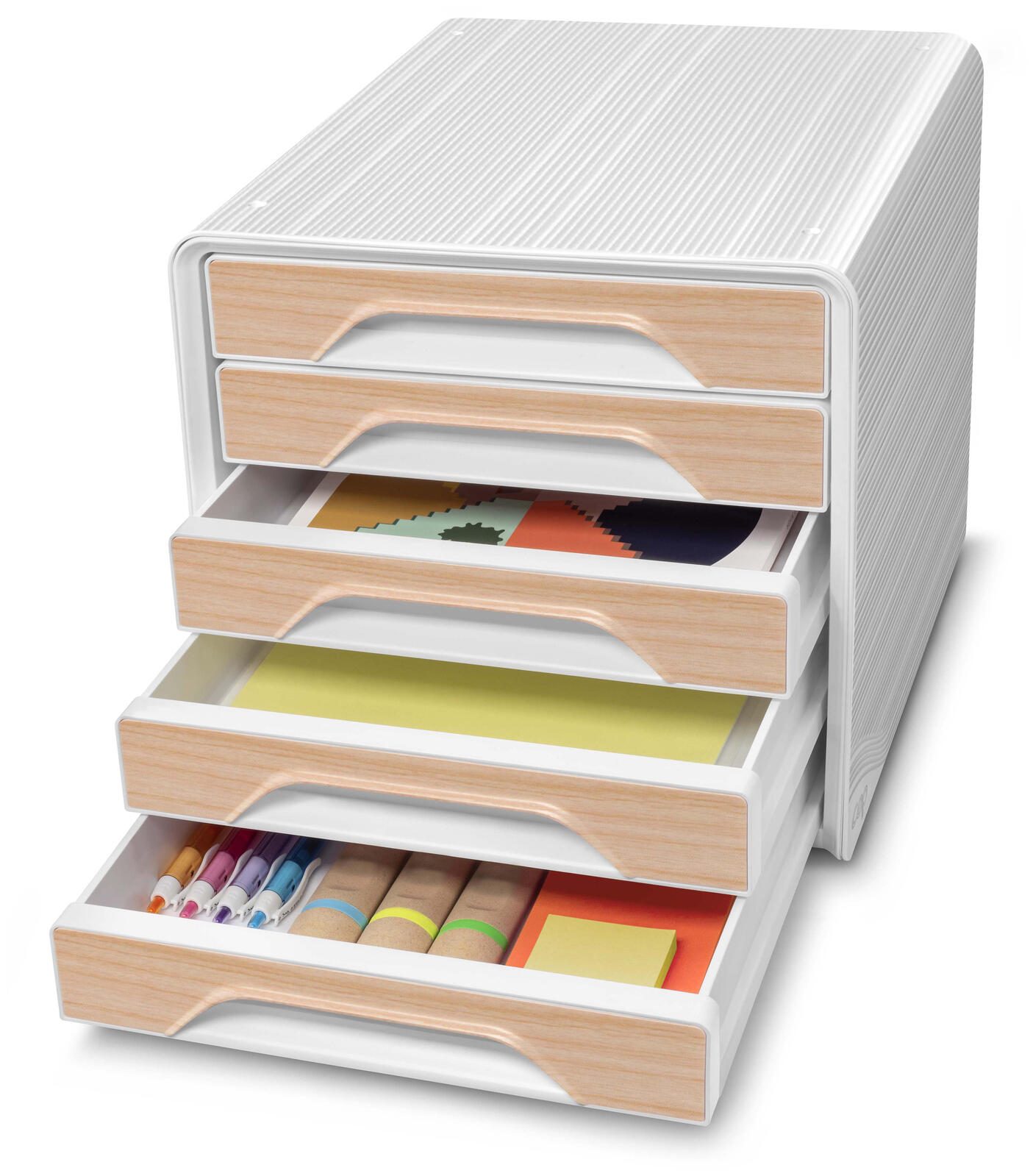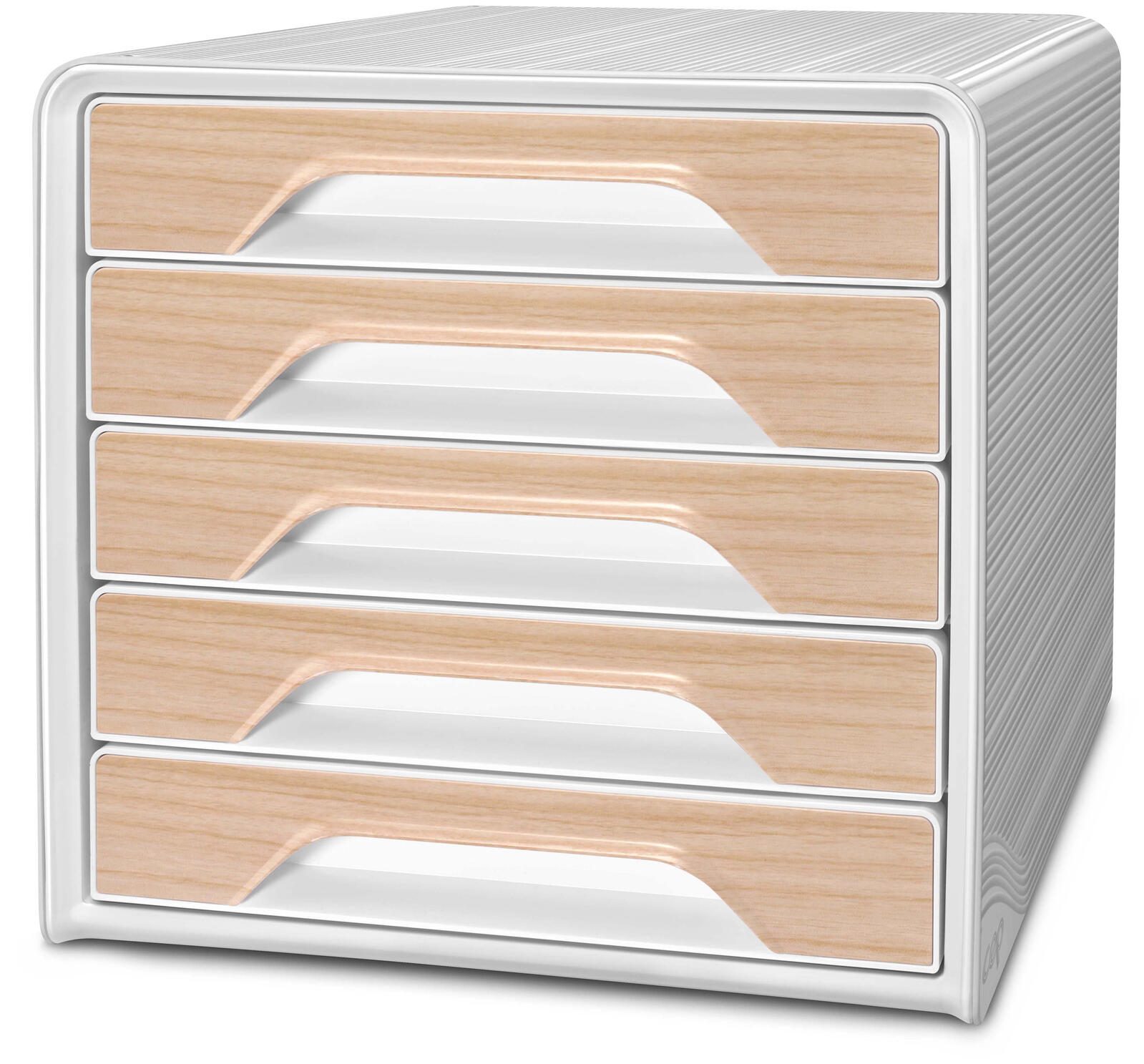 Die cep Schubladenbox 1071111021 ist die ideale Lösung zur Aufbewahrung und Organisation von Dokumenten im DIN A4 Format. Mit ihren kompakten Maßen von 28,8 x 36,0 x 27,1 cm bietet sie ausreichend Platz für bis zu fünf Schubladen, in denen du deine Unterlagen ordentlich und übersichtlich verstauen kannst. Die Schubladenbox ist in einem eleganten Weiß mit einem ansprechenden Buche-Farbton gehalten, was ihr ein modernes und ansprechendes Aussehen verleiht. Hergestellt aus hochwertigem Polystyrol, zeichnet sich die Schubladenbox durch ihre Langlebigkeit und Stabilität aus. Die geschlossenen Schubladen schützen deine Dokumente vor Staub und Beschädigungen, sodass du dir keine Sorgen um die Sicherheit deiner Unterlagen machen musst. Zudem ist die Box stapelbar, was dir die Möglichkeit gibt, mehrere Einheiten platzsparend übereinander zu lagern und so deinen Arbeitsplatz optimal zu nutzen. Die cep Schubladenbox gehört zur Serie Smoove und ist nicht nur funktional, sondern auch ästhetisch ansprechend. Sie fügt sich nahtlos in jedes Büro oder Home-Office ein und sorgt für eine aufgeräumte Umgebung. Mit dieser Schubladenbox kannst du deine Arbeitsmaterialien effizient organisieren und gleichzeitig einen Hauch von Stil in deinen Raum bringen. Die einfache Handhabung der Schubladen macht es leicht, schnell auf benötigte Dokumente zuzugreifen. Egal, ob du wichtige Unterlagen, Rechnungen oder Notizen aufbewahren möchtest, die cep Schubladenbox bietet dir die perfekte Lösung. Vertraue auf die Qualität und das durchdachte Design von cep, um deinen Arbeitsplatz optimal zu gestalten.Technische Daten