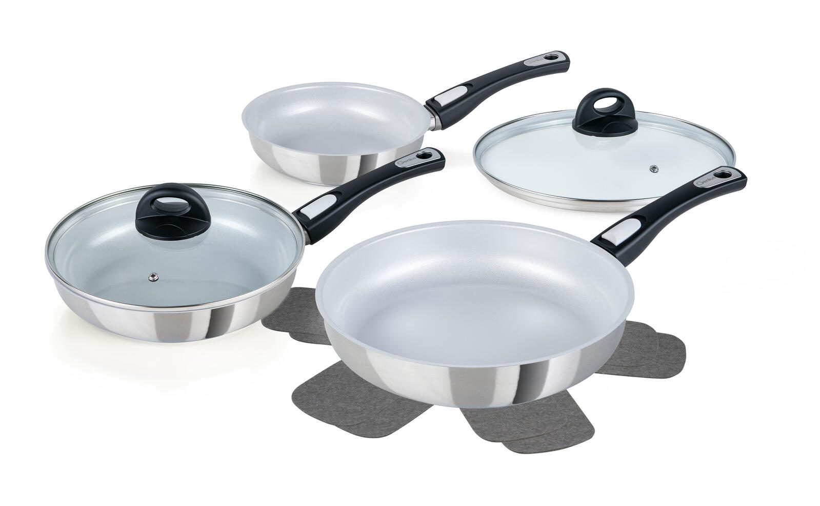 Das Genius Cerafit Steel Pfannen-Set in elegantem Silber vereint stilvolles Design mit herausragender Funktionalität. Dieses 7-teilige Set ist nicht nur ein Blickfang in deiner Küche, sondern bietet auch eine Vielzahl von Vorteilen, die das Kochen zum Vergnügen machen. Die Pfannen sind mit einer hochwertigen Antihaftbeschichtung ausgestattet, die ein Anhaften von Speisen verhindert und somit die Zubereitung gesunder Gerichte erleichtert. Du kannst fettfreier kochen und dabei den vollen Geschmack deiner Zutaten genießen. Gefertigt aus robustem Edelstahl und einer speziellen Keramikbeschichtung, zeichnen sich die Pfannen durch ihre Langlebigkeit und Widerstandsfähigkeit aus. Das Material sorgt für eine gleichmäßige Wärmeverteilung, sodass deine Speisen perfekt gegart werden. Zudem sind die Pfannen mit einem passenden Deckel ausgestattet, der das Garen beschleunigt und das Aroma der Speisen bewahrt. Die silberne Farbe verleiht deinem Kochgeschirr eine moderne Note und passt zu jeder Kücheneinrichtung. Die Cerafit Steel Serie von Genius steht für Qualität und innovative Technologien, die das Kochen einfacher und angenehmer machen. Egal, ob du ein schnelles Abendessen zubereiten oder ein aufwendiges Gericht kreieren möchtest, dieses Pfannen-Set bietet dir die Flexibilität und Leistung, die du benötigst. Investiere in das Genius Cerafit Steel Pfannen-Set und erlebe, wie sich dein Kocherlebnis verbessert. Mit diesem Set wird das tägliche Kochen nicht nur einfacher, sondern auch stilvoller.Technische Daten