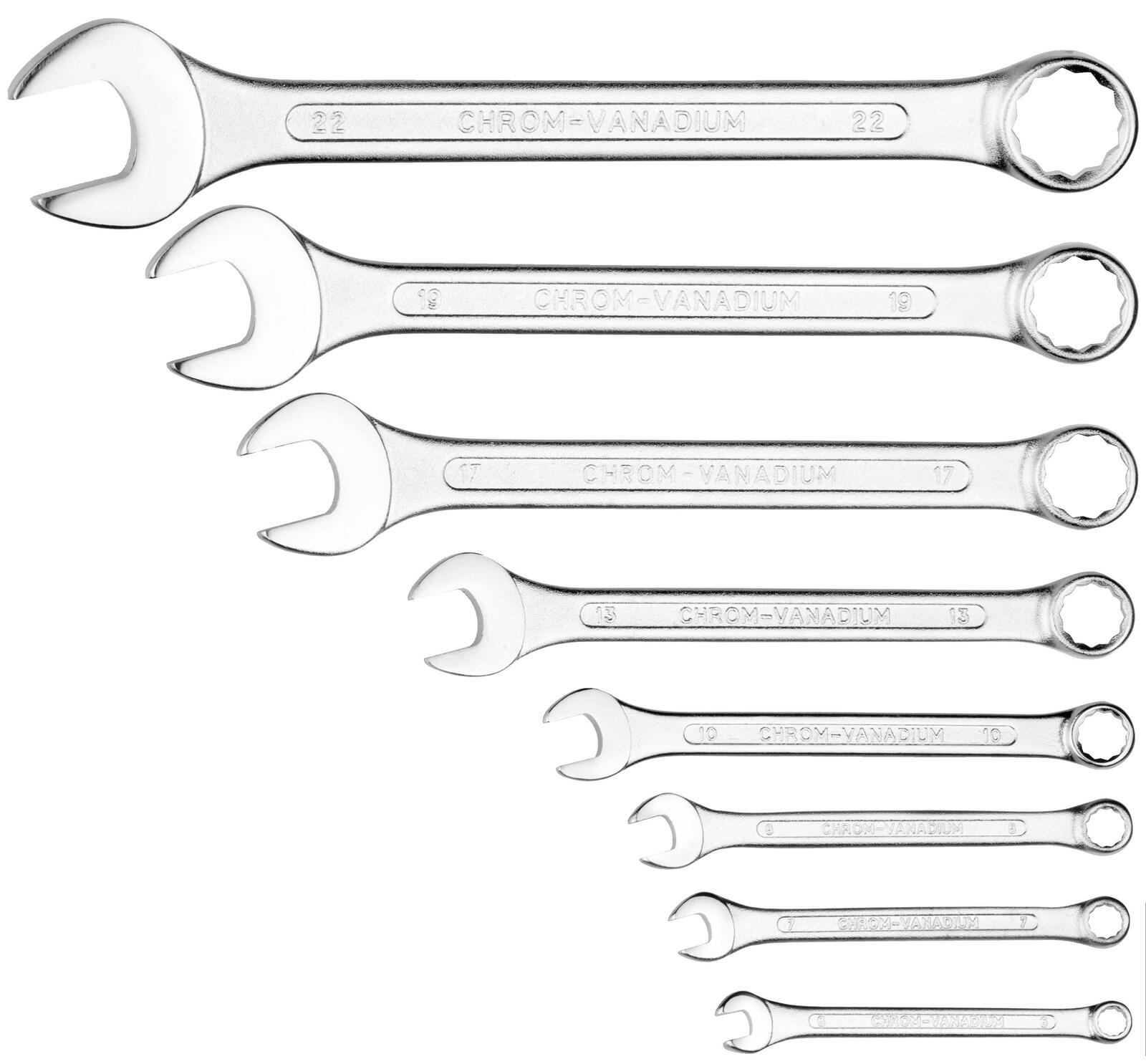 Die Werkzeuge sind aus hochwertigem Chrom-Vanadium-Stahl gefertigt, einem Material, das für seine Robustheit und Langlebigkeit bekannt ist. Die silberne Oberfläche sorgt für eine ansprechende Optik und erleichtert zudem die Reinigung der Schlüssel. Durch die Kombination von Ring- und Maulschlüsselprofilen bieten die Werkzeuge vielseitige Einsatzmöglichkeiten bei der Bearbeitung von Schrauben und Muttern.