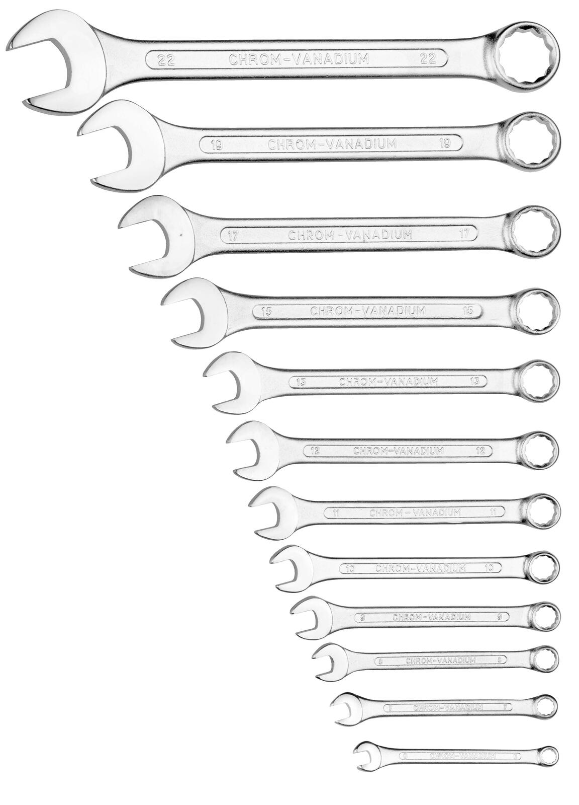 Der Satz enthält Schlüssel in den Größen 6, 7, 8, 9, 10, 11, 12, 13, 15, 17, 19 und 22 Millimeter. Damit deckt er ein breites Spektrum an gängigen Schraubengrößen ab und eignet sich sowohl für den Heimwerker als auch für den professionellen Einsatz. Die Schlüssel sind in einem praktischen Kunststoffhalter untergebracht, der für Ordnung sorgt und den Transport erleichtert.