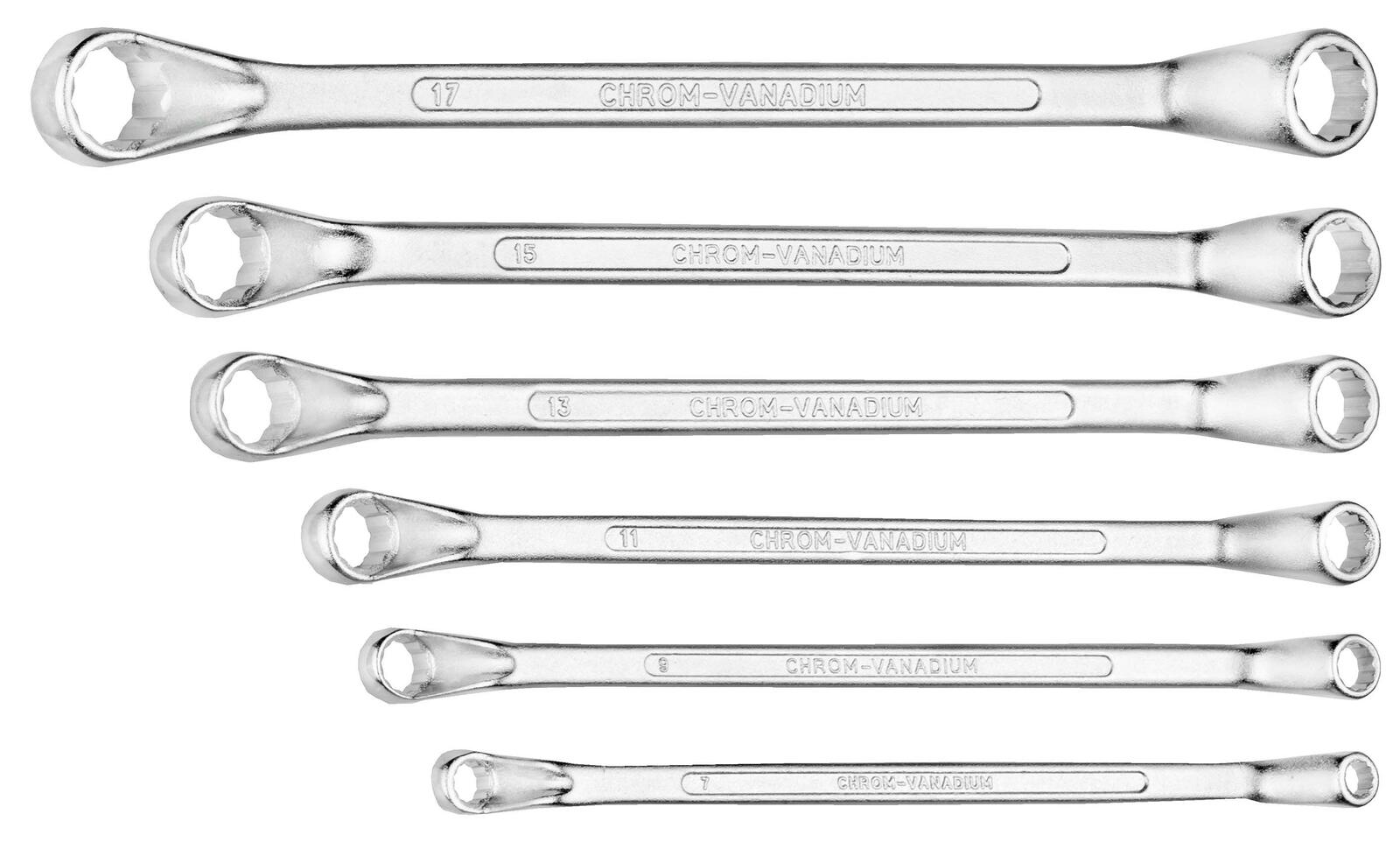 Der Satz enthält die folgenden Schlüsselgrößen: 6 x 7 mm, 8 x 9 mm, 10 x 11 mm, 12 x 13 mm, 14 x 15 mm und 16 x 17 mm. Diese Auswahl deckt ein breites Spektrum an Schraubengrößen ab und ermöglicht präzises Arbeiten bei verschiedenen Montage- und Reparaturaufgaben. Die Lieferung erfolgt praktisch im Kunststoffhalter, der eine übersichtliche Aufbewahrung und einfachen Transport gewährleistet.