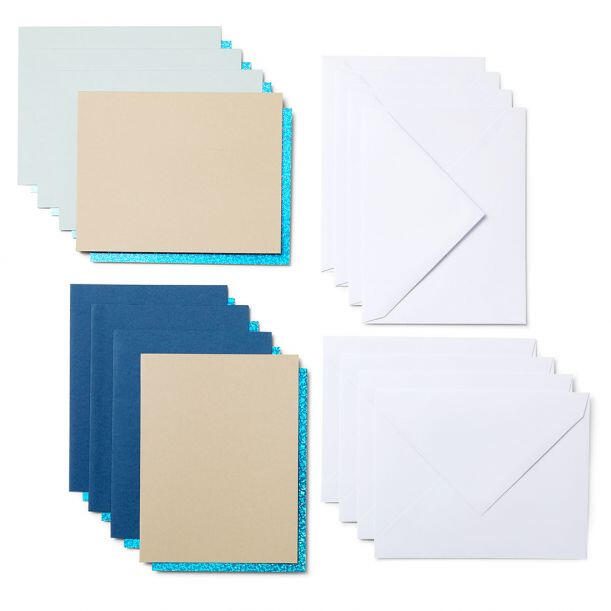 - 8 Karten mit Klebefläche (3 Mitternachtsblau, 2 Khaki, 3 Whispering Blue), 8 holografisch blaue Hintergrundblätter, 8 weiße Umschläge