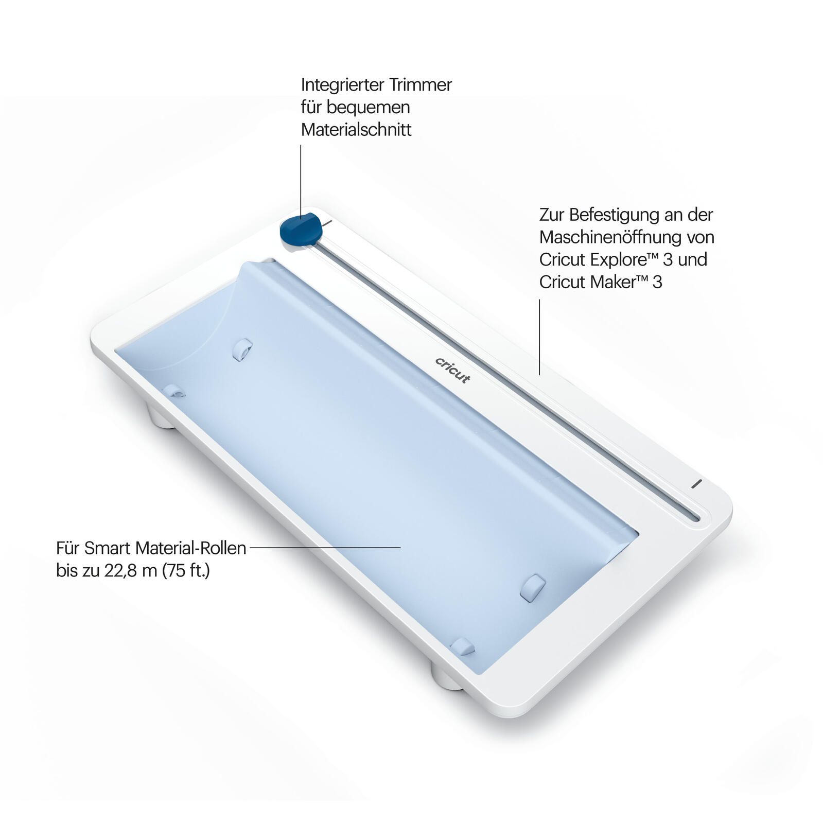 Für saubere, präzise Schnitte halte deine Cricut Smart Materials™ sauber und ordentlich. Das besondere Design des Cricut Rollenhalters hält dein Material und führt es sicher in die Cricut Schneidemaschine ein. So kannst du Projekte ohne Schneidematte zuschneiden. Einfach einlegen und loslegen! Mit einem tiefen Schacht, der Cricut Smart Materialrollen zwischen 3 und 22,8 m (4–75 ft) aufnehmen kann, lässt sich dieses Zubehörteil in Sekundenschnelle an deiner Maschine anbringen. Der eingebaute Trimmer stellt eine durchgängig saubere Schnittkante sicher. Schluss mit Materialstau! Zur Verwendung mit Cricut Explore 3 und Cricut Maker 3.