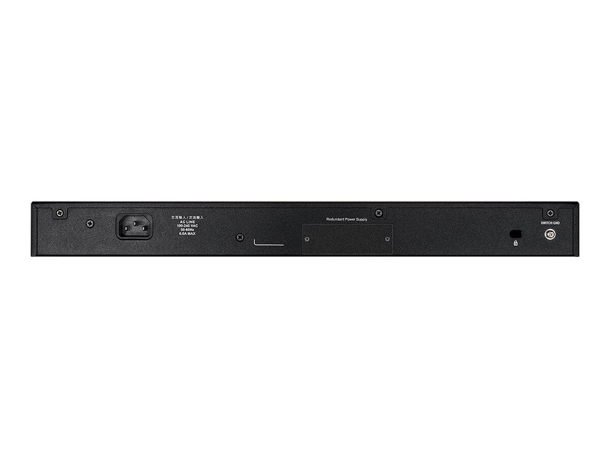 28-Port Layer 3 Gigabit PoE Stack Switch (SI), D-Link xStack, 24x 10/100/1000Mbit/s TP (RJ-45) PoE Ports mit bis zu 30W Ausgangsleistung, davon 4x TP Combo Port/Mini-GBIC (SFP) Slot für opt. 1Gbit/s Fiber Transceiver, 4x 10 Gigabit/s SFP+ Slots, Switch Fabric: 128Gbit/s, 95,24Mio Pakete/s, Smart Fans, opt. externes redundantes Netzteil, Ring-Stack: Max. 9Geräte, max. 80Gbit/s Stack-Bandbreite, Single IP Management (SIM): managed bis zu 32 Geräte über eine einzige IP Adresse, Layer2 Switching, IPv4 und IPv6 statisches Routing, 802.1Q VLAN, GARP/GVRP, IP Multicast Support, IGMP Snooping, Multi-Layer (2-4) QoS/CoS, Jumbo Frame, Bandbreiten-Management, D-Link Safeguard Engine, 802.3ad Link Aggregation, 802.1w Rapid und 802.1s Multiple Spanning Tree, OAM mit 802.3ah und 802.1ag/ITU-T Y.1231, LLDP und LLDP-MED, 802.1x Access Control, Multi-Layer Access Control List (ACL), RADIUS/TACACS+ Authentifzierung, SSH, SSL, SNMP v1, v2c, v3, RMON, Console Port, TELNET, Web Management, Port Mirroring, sFlow, Powerbudget 370 W (740 W mit DPS-700 RPS)