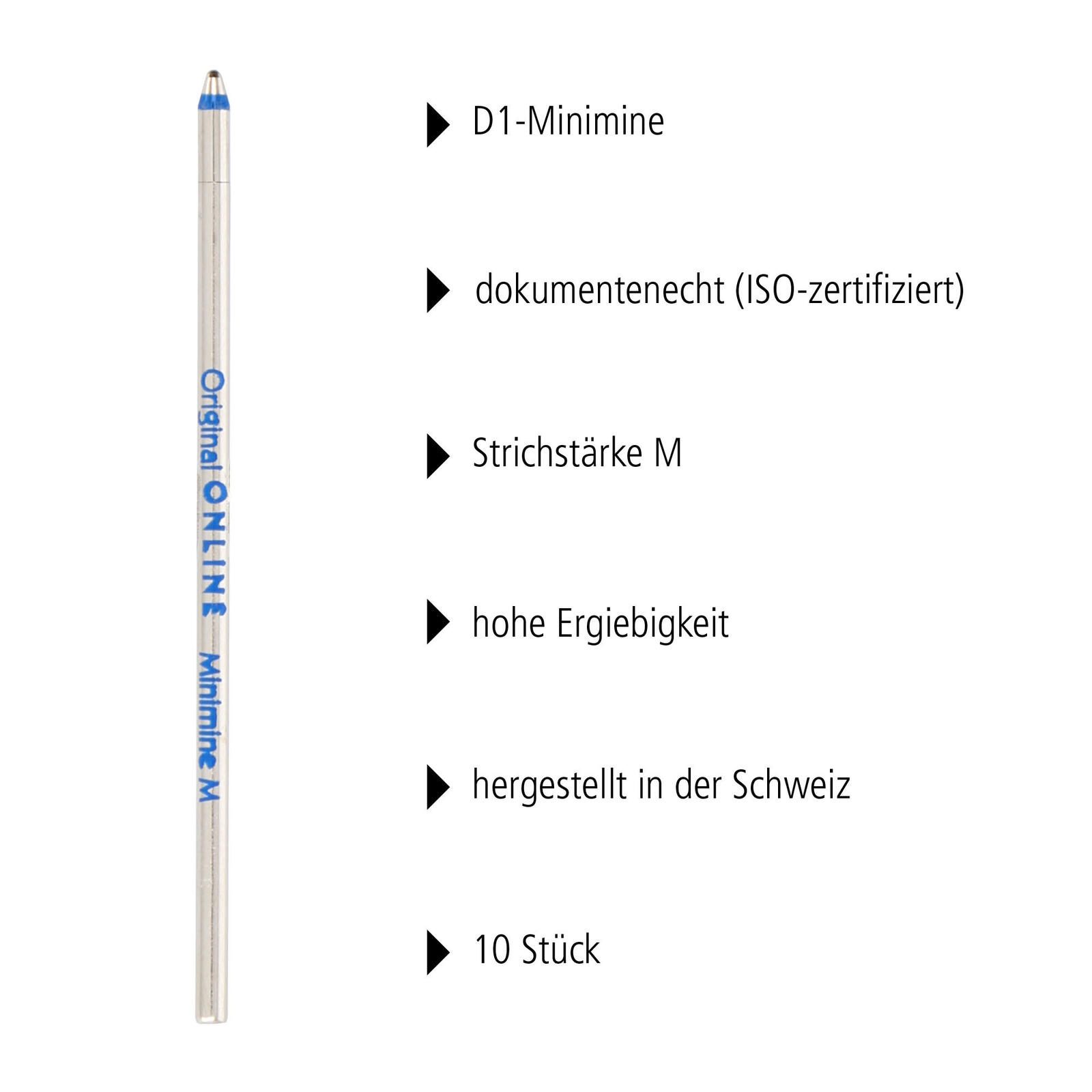 Die ONLINE® Kugelschreiberminen D1 in der Schreibfarbe Blau bieten eine zuverlässige und qualitativ hochwertige Lösung für alle, die Wert auf präzises und angenehmes Schreiben legen. Diese Minen sind gemäß der ISO-Norm 12757-2 DOC klassifiziert und garantieren eine gleichmäßige Tinte, die für ein flüssiges Schreiberlebnis sorgt. Mit der Strichstärke M (mittel) eignen sich die Minen sowohl für feine Notizen als auch für kräftige Schriftzüge, was sie zu einem vielseitigen Begleiter im Alltag macht.