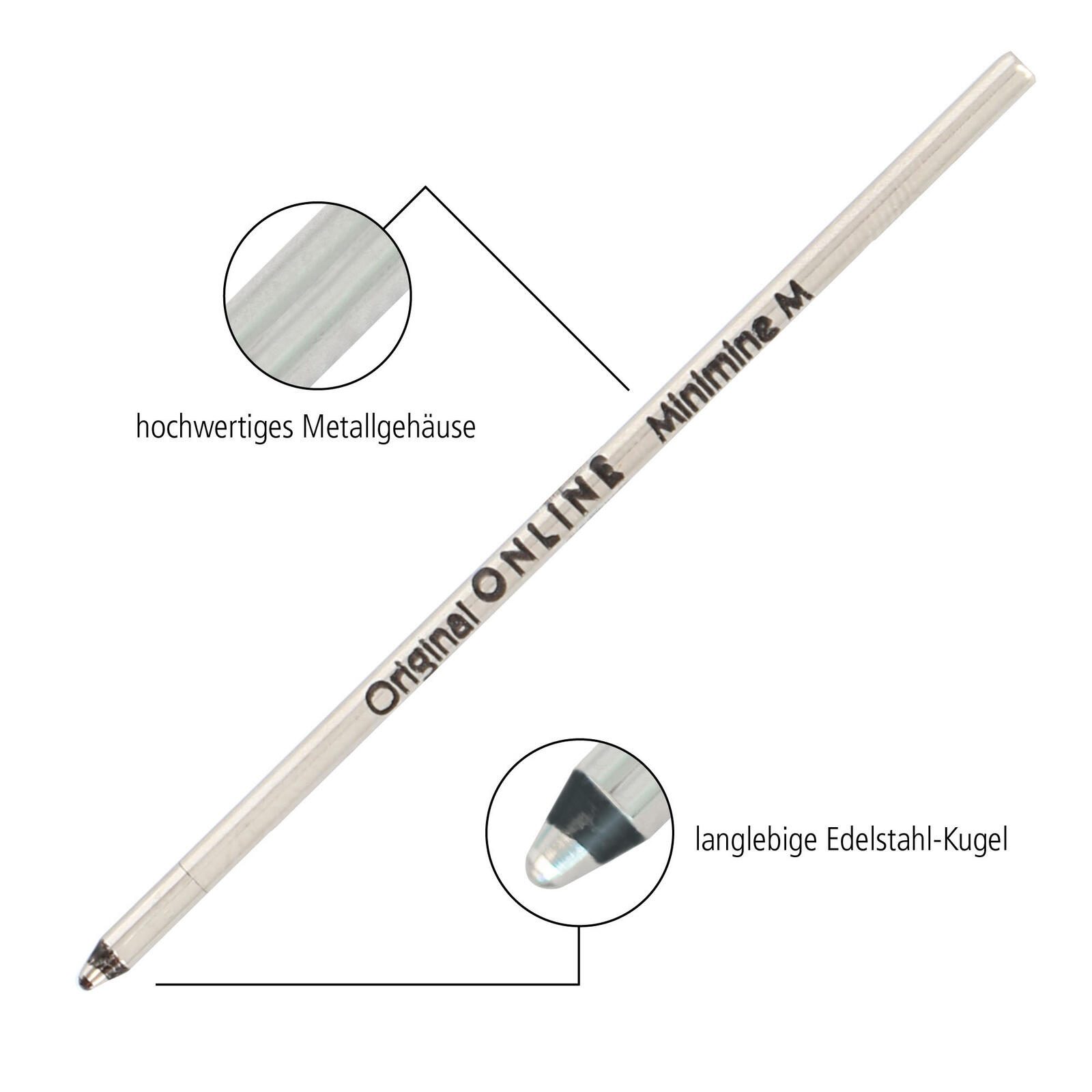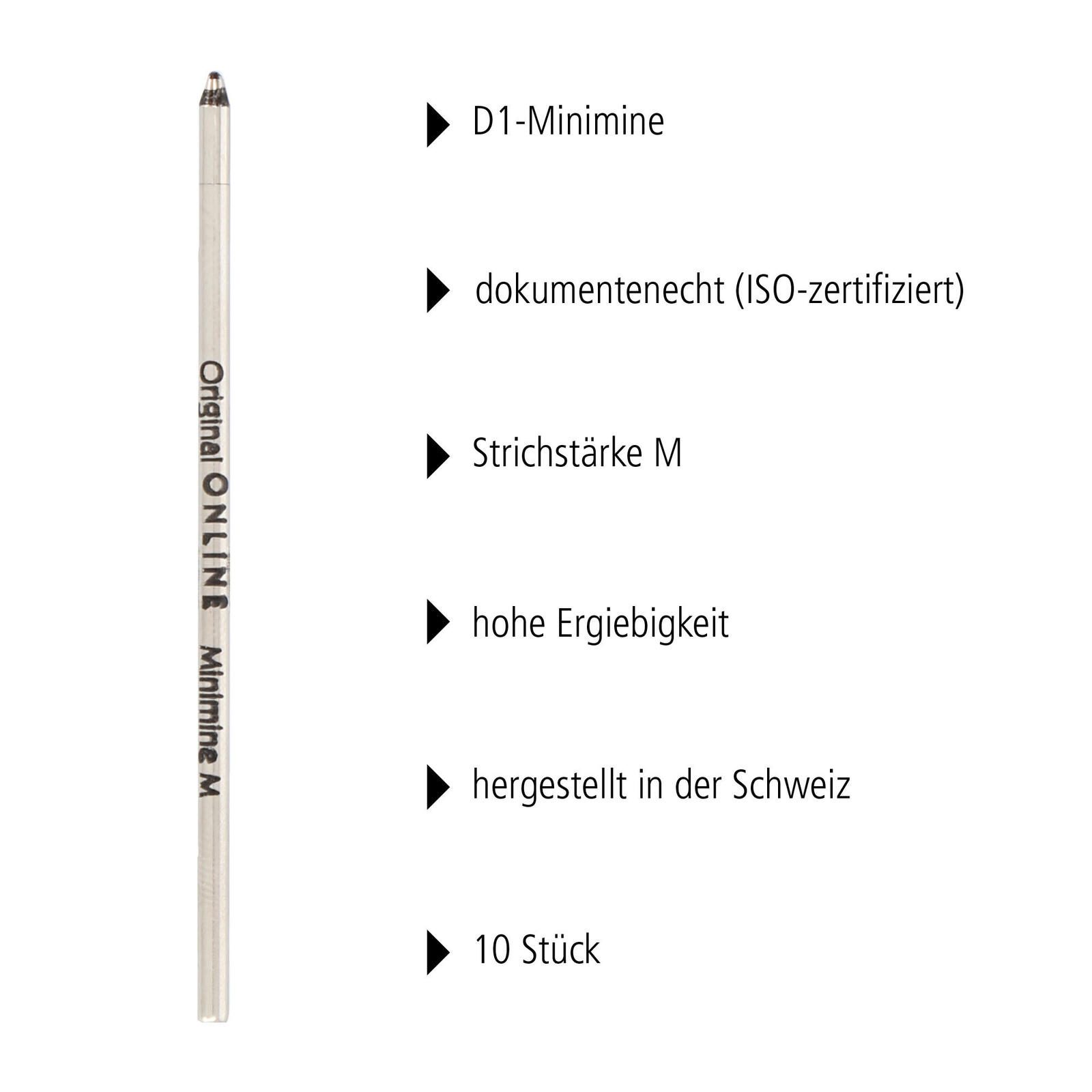 Die ONLINE® Kugelschreiberminen D1 sind die ideale Wahl für alle, die Wert auf Qualität und Zuverlässigkeit legen. Diese Minen entsprechen der ISO-Norm 12757-2 DOC und sind speziell für kleine Kugelschreiber, Mehrfarbschreiber und Multipens konzipiert. Mit einer mittleren Mine (M) bieten sie ein angenehmes Schreibgefühl und eine gleichmäßige Tinte, die das Schreiben zum Vergnügen macht. Die Schreibfarbe Schwarz sorgt für klare und präzise Linien, die sich perfekt für Notizen, Zeichnungen oder Dokumente eignen. Obwohl die Strichstärke nicht näher angegeben ist, kannst du dich auf eine konstante und hochwertige Leistung verlassen, die deinen Anforderungen gerecht wird. Die Minen sind permanent, was bedeutet, dass deine Schriftzüge lange erhalten bleiben und nicht verblassen. Ein Pack enthält 10 Stück dieser hochwertigen Kugelschreiberminen, sodass du immer ausreichend Nachschub zur Hand hast. Die ONLINE® Kugelschreiberminen D1 sind nicht nur praktisch, sondern auch eine kosteneffiziente Lösung für den täglichen Gebrauch. Egal, ob im Büro, in der Schule oder im Homeoffice, diese Minen bieten dir die Flexibilität und Zuverlässigkeit, die du benötigst. Vertraue auf die bewährte Qualität von ONLINE® und erlebe das angenehme Schreibgefühl mit den Kugelschreiberminen D1 in Schwarz.Technische Daten