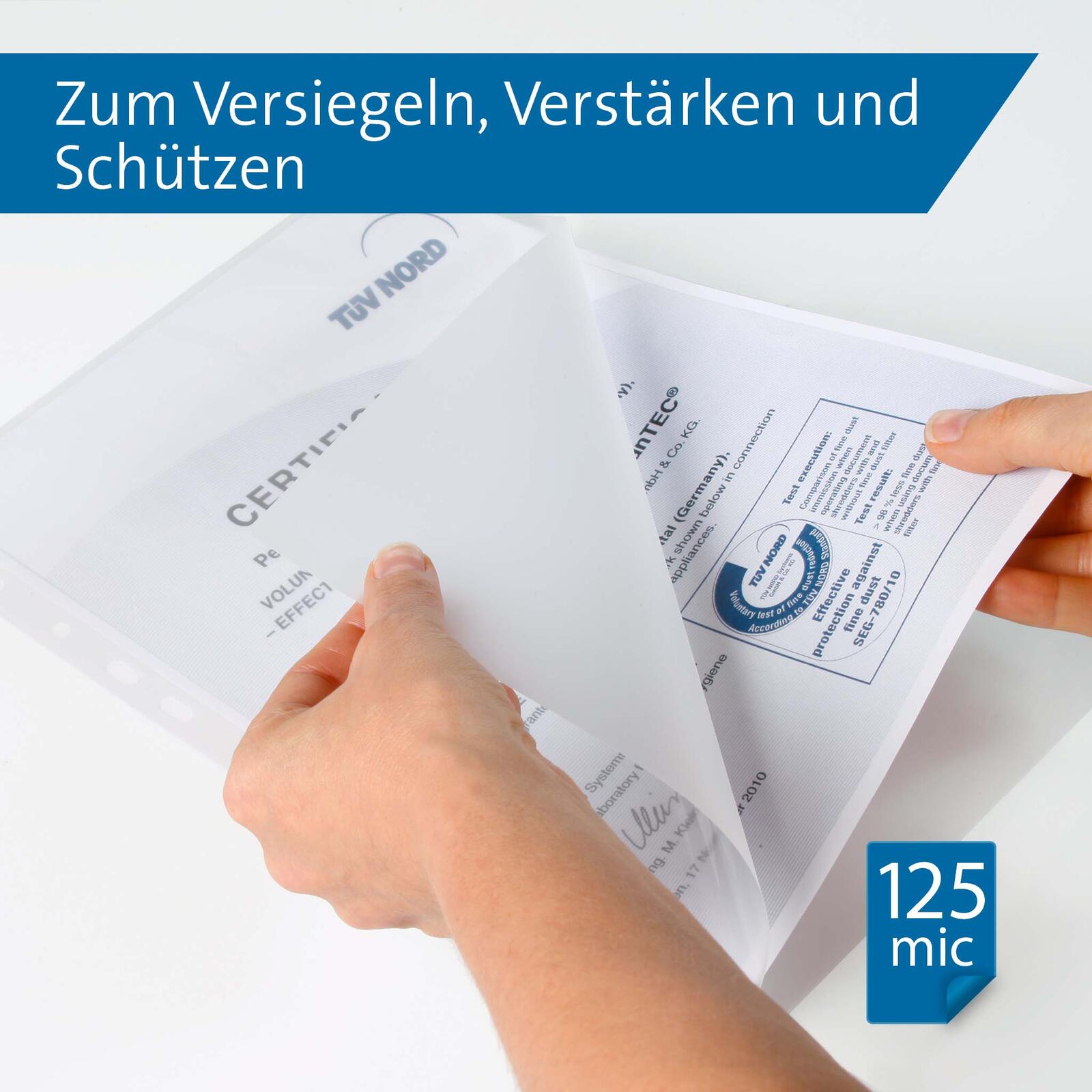 Die Folien sind aus Polyethylen gefertigt und verfügen über abgerundete Ecken, was die Handhabung erleichtert und das Risiko von Beschädigungen an den Dokumenten reduziert. Die Schweißnaht befindet sich an der kurzen Seite der Folien, was für eine sichere Versiegelung sorgt. Eine Lochung ist nicht vorhanden, und die Folien sind nicht selbstklebend.