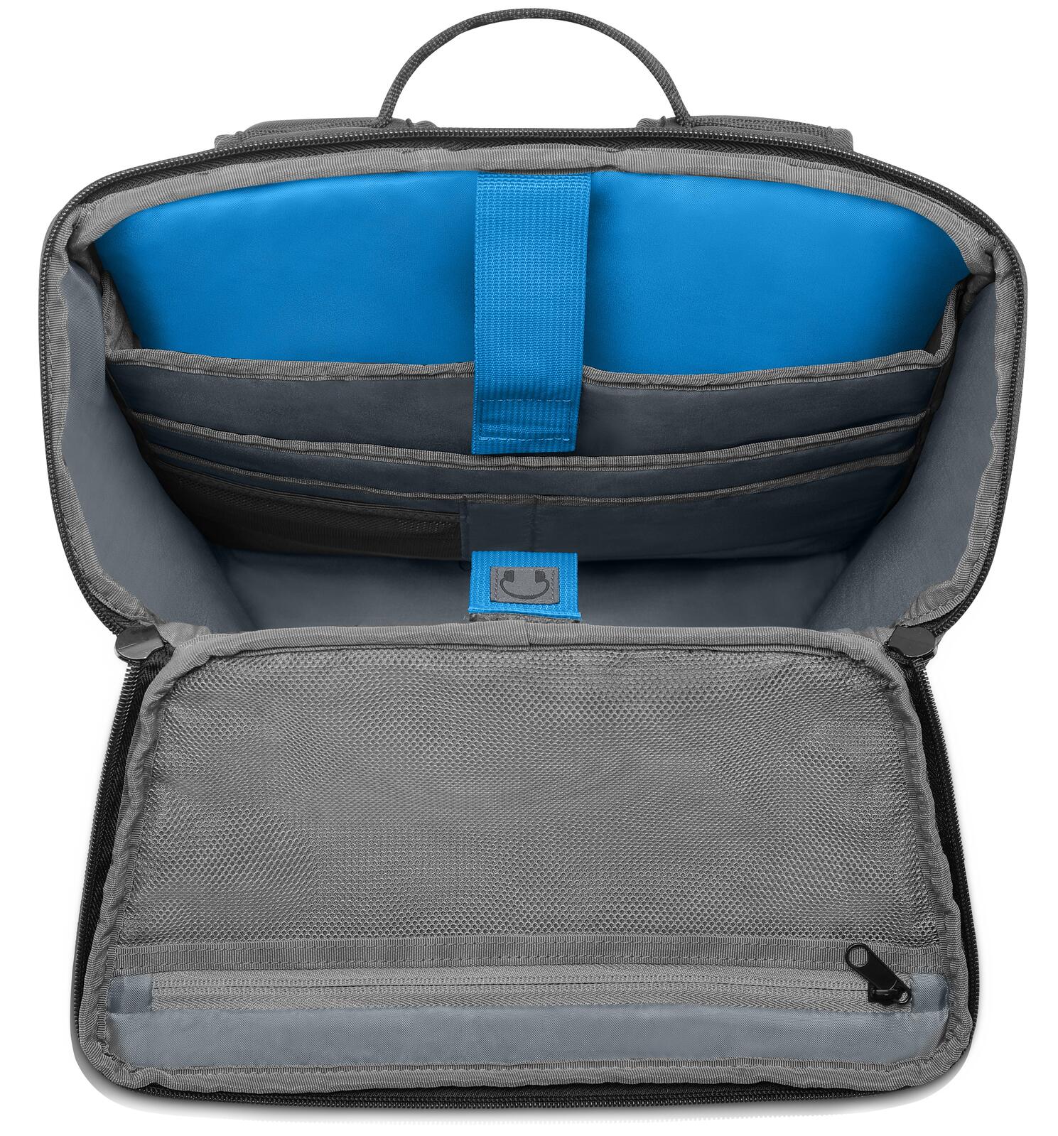 Viel Speicherplatz für geschäftige TageIm Inneren befindet sich eine Laptop-Schutzhülle, mit der Sie Ihr Dell Laptop der G-Serie für den Transport zu LAN-Turnieren oder zu gelegentlichen Spielesitzungen mitnehmen können. In der tiefen Tasche können Sie Bücher, Notizen und wichtiges Gaming-Zubehör unterbringen, einschließlich eines Headsets auf dem integrierten Haken-und-Schlaufen-Halter. Die Netztasche mit Reißverschluss an der Oberseite erleichtert das Aufbewahren kleinerer Zubehörteile. In den Zubehörfächern können Sie Stifte, Schreibwaren und ähnliches unterbringen. Verwenden Sie die beiden elastischen Taschen an der Seite, um eine Wasserflasche oder einen Regenschirm mitzunehmen.