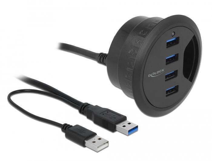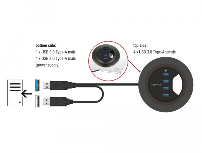 Dieser Hub von Delock kann in eine vorhandene Aussparung des Schreibtisches mit einem Durchmesser von 60 mm bzw. 80 mm eingesetzt werden, um diese für die Durchführung der Monitor-, Tastatur- und Mauskabel zu nutzen. Gleichzeitig bietet der Hub vier USB Typ-A Buchsen. Durch einen USB 3.0 Typ-A Stecker und einen USB 2.0 Typ-A Stecker wird die Datenübertragung bzw. Stromversorgung gewährleistet. Der Abstand zwischen den freien Anschlüssen darf maximal 20 cm betragen, da die zwei Kabel miteinander verbunden sind.