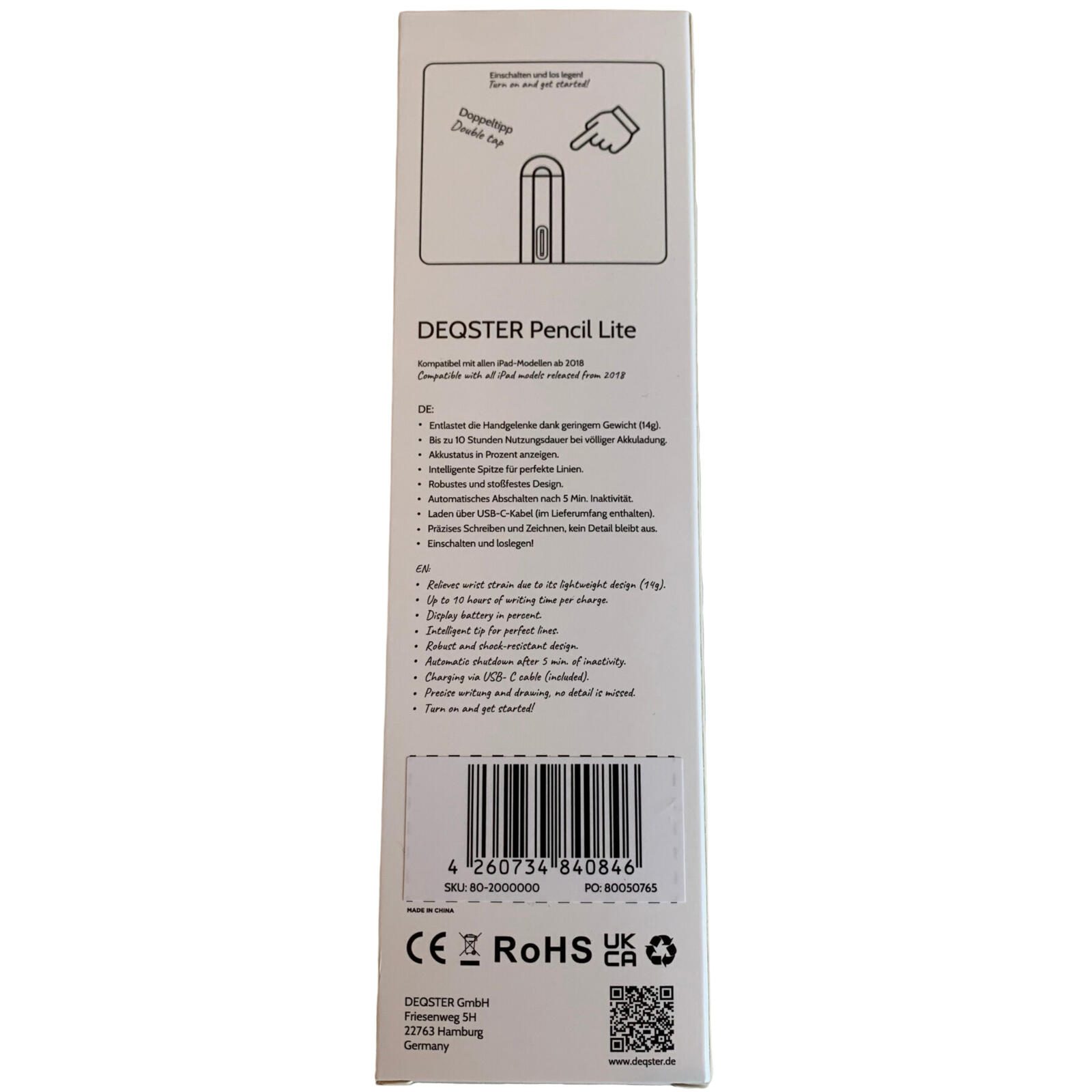 Mit nur 14 Gramm ist der DEQSTER Pencil Lite ein wahres Fliegengewicht und ideal für alle, die ein leichtes, aber leistungsstarkes Werkzeug für ihre kreativen oder beruflichen Projekte suchen. Seine einfache Verbindungsfähigkeit ohne lästiges Bluetooth-Pairing macht ihn sofort einsatzbereit. Ob für Kinder oder Erwachsene – der Pencil Lite liegt durch sein ergonomisches Design und das geringe Gewicht angenehm in der Hand und ermöglicht stundenlanges Arbeiten ohne Ermüdungserscheinungen.
