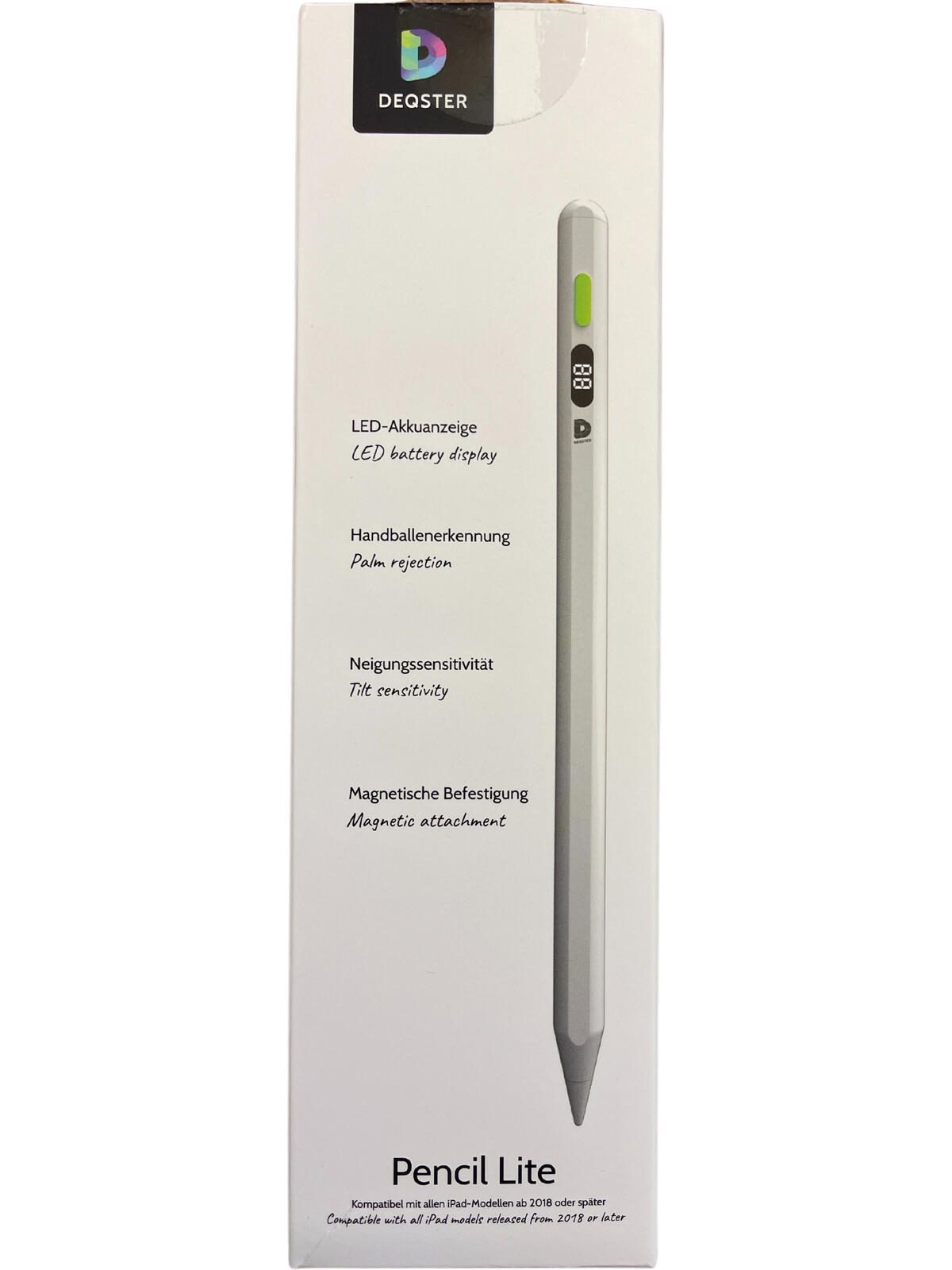 Der DEQSTER Pencil Lite kommt mit austauschbaren Spitzen, Handballenerkennung, Tilt Funktion für Neigungswinkelerkennung und ist gegen Staub und Spritzwasser geschützt. Im Lieferumfang enthalten sind neben dem Pencil Lite ein USB-C Ladekabel und zwei Ersatzspitzen. Entdecke jetzt, wie der DEQSTER Pencil Lite dein Arbeiten auf dem iPad revolutioniert!