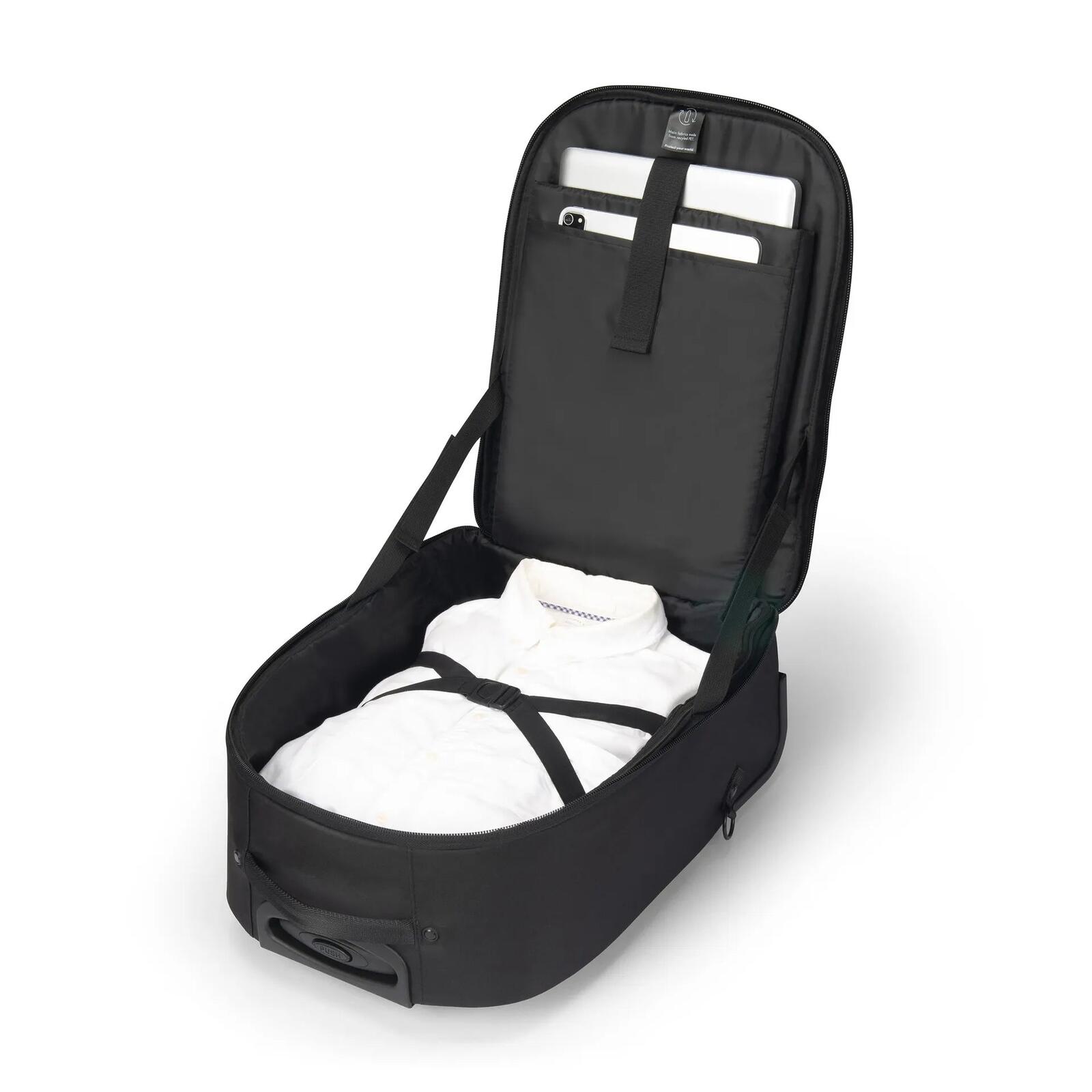 Unsere Taten von heute gestalten die Welt von morgen. Deshalb setzt DICOTA auf ökologisch sinnvolle Lösungen und stellt alle ECO-Kollektionen aus nachhaltigem Recycling-PET her. Bis zu 36 PET-Flaschen werden einer zweiten Nutzung zugeführt. Sie erhalten damit ein umweltfreundliches Produkt, mit lebenslanger Garantie. Auf die bestens bekannte Qualität, Haptik und Optik müssen Sie auch bei den rPET-Produkten nicht verzichten. Mit einem grosszügigen Stauraum von 33 Litern bietet der Backpack Trolley Eco CORE ausreichend Platz für den täglichen Bedarf. Das mit High-Density Foam (HDF) gepolsterte Notebookfach schützt den Laptop sicher, während das geräumige Hauptfach mit praktischer Unterteilung die Organisation von Dokumenten und Zubehör erleichtert. Die Vordertasche ist speziell für mobiles Zubehör konzipiert, und die Reissverschlusstasche bietet Stauraum für Netzteil und Kabel. Das versteckte Fach für einen GPS-Tracker ermöglicht es, den Rucksack jederzeit im Auge zu behalten, während die Reissverschlusstasche mit RFID-Blocker persönliche Daten vor unbefugtem Zugriff schützt. Die praktisch verstaubaren Schultergurte ermöglichen den schnellen Wechsel zwischen Rucksack- und Trolleyfunktion. Die praktischen, platzsparenden Seitentaschen bieten zusätzlichen Stauraum für Regenschirm oder Trinkflasche und das wasserabweisende Material schützt Rucksack und Inhalt bei unerwarteten Wetterumschwüngen.