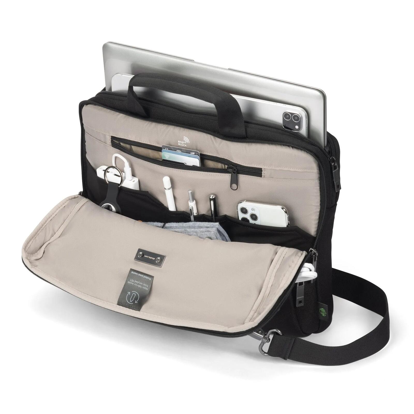 FIVE ist die Premium-Business-Linie von DICOTA, die für Geschäftsleute entwickelt wurde, die mehr als nur eine Tasche brauchen. Sie bietet intelligente Organisation, verbesserten Schutz und täglichen Komfort - hergestellt aus langlebigen, recycelten Materialien für eine nachhaltige und zuverlässige Lösung für moderne Business-Mobilität. Die leichte, sichere und für perfekte Mobilität konzipierte Slim Case FIVE schützt Ihre wichtigsten Utensilien, ohne die Tasche zu überladen. Das abschließbare Notebookfach mit DCT Notebook Protection sorgt für maximale Sicherheit, während ein integriertes Steckfach Tablets bis zu 12,9" sicher aufnimmt. Eine Vordertasche mit strukturierten Fächern organisiert das Zubehör, und ein separates Fach auf der Rückseite bietet Platz für Dokumente. Hergestellt aus 16,5 recycelten PET-Flaschen ist sie eine nachhaltige und praktische Wahl für moderne Berufstätige.