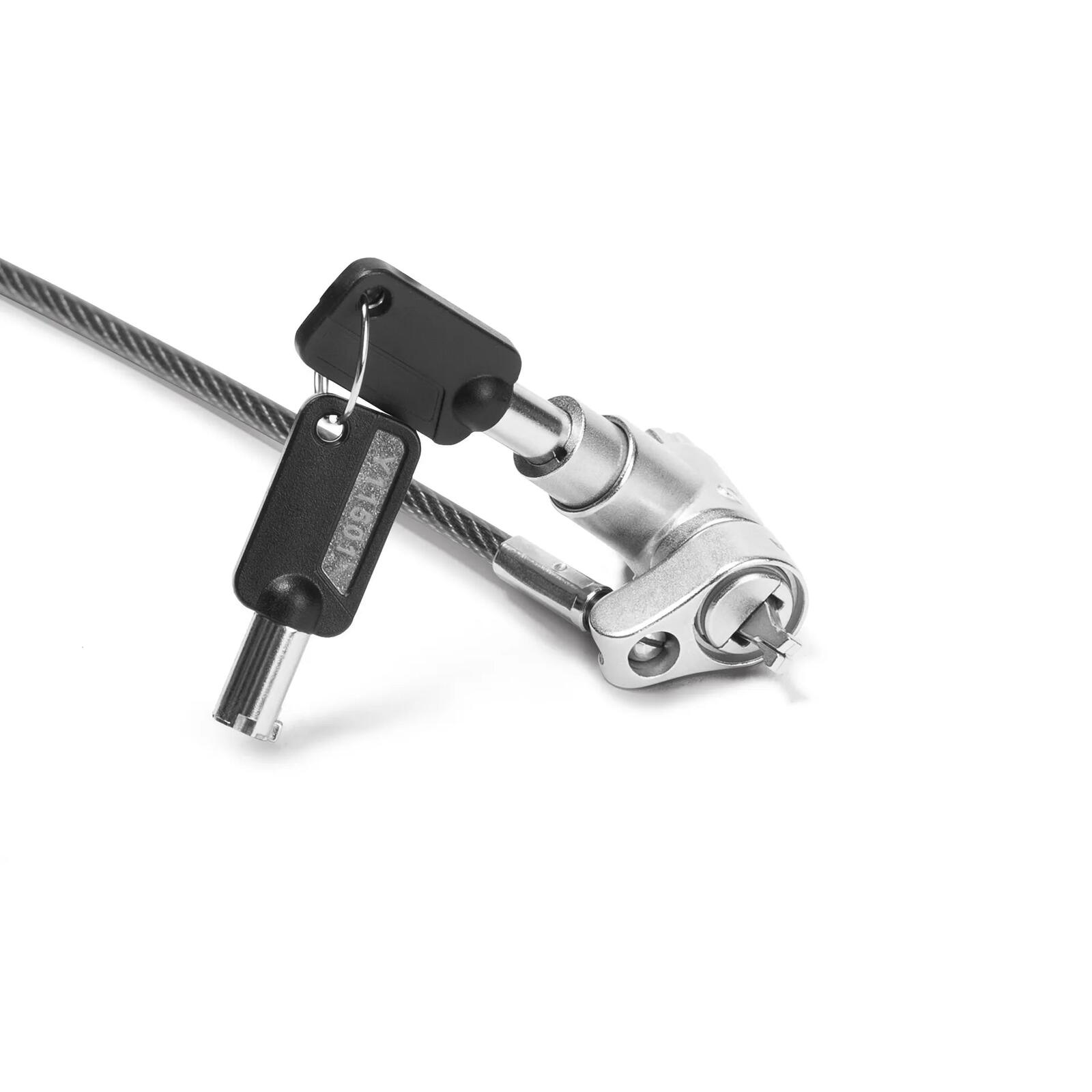 Dank des stufenlos per Drehknopf einstellbaren Schlosskopfes ist das Sicherheitskabel mit nahezu allen gängigen Slots für Schlösser kompatibel. Ob T-Lock, Wedge, Nano Slot oder proprietäre Zwischengrößen: Mit nur einem Schloss sichern Sie verschiedene Gerätegenerationen und bleiben langfristig flexibel. Neben Notebooks lassen sich auch Monitore, Projektoren oder Drucker effektiv fixieren, wenn sie über einen entsprechenden Slot im Gehäuse verfügen.<break>Die Push-to-Lock-Funktion ermöglicht ein schnelles Verriegeln mit nur einer Hand – ganz ohne Schlüssel. Ideal für den hektischen Arbeitsalltag. Das 2 m lange, kunststoffummantelte Stahlseil bietet hohe Zugfestigkeit und schützt zuverlässig vor Wegnahme, ohne das Gerät zu beschädigen. Für den mobilen Einsatz lässt sich das Kabel dank Klettverschluss kompakt verstauen.<break>Zwei Schlüssel sind im Lieferumfang enthalten. Das Schloss ist als Einzellösung konzipiert und richtet sich an Anwender, die unkomplizierte, sofort einsatzbereite Gerätesicherheit benötigen.<break><break><break>