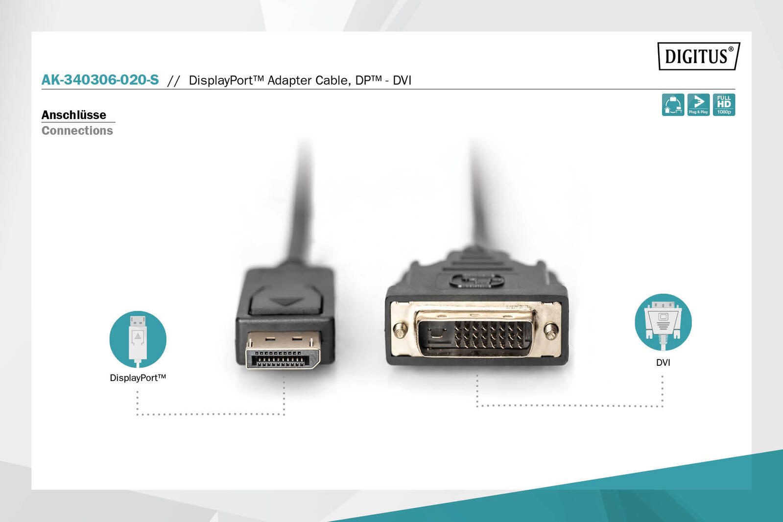 Digitus DisplayPort-Adapterkabel - DisplayPort / DVI 2m m/interlock, DP 1.1a komp., CE, schwarz, AK-340306-020-S
