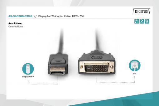 Digitus DisplayPort-Adapterkabel - DisplayPort / DVI 3m m/interlock, DP 1.1a komp., CE, schwarz, AK-340306-030-S
