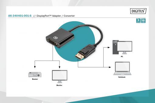 Digitus DisplayPort-Adapterkabel - DisplayPort / DVI 0,15m m/Verriegelung, DP 1.1 komp., CE, schwarz, AK-340401-001-S