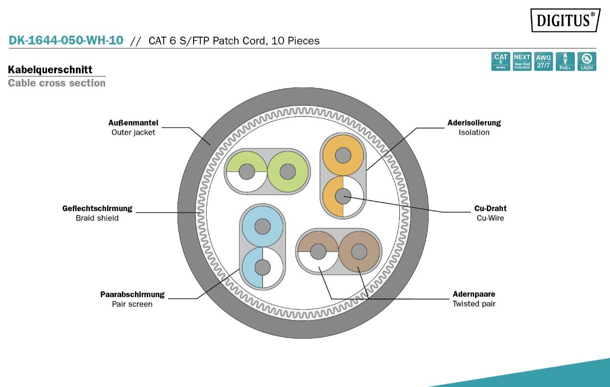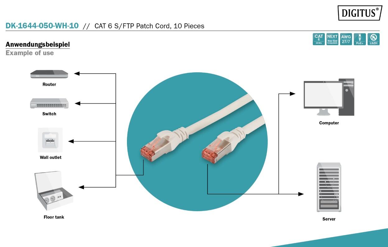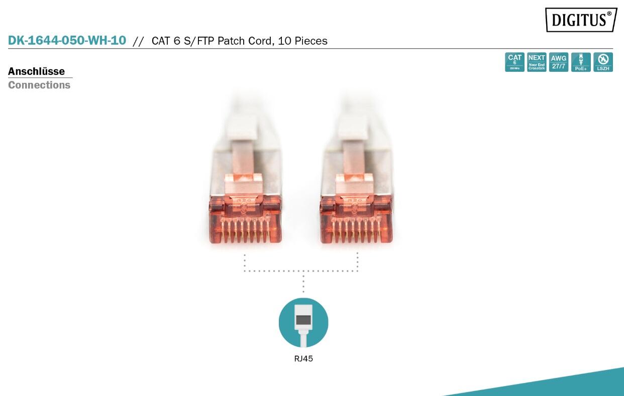 Digitus Professional CAT 6 S/FTP Patch-Kabel 5m RJ-45 (M) 10er Pack Weiß Patchkabel rund DK-1644-050-WH-10