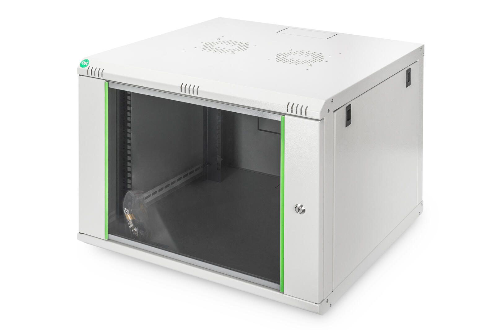 Die Netzwerkschränke zur Wandmontage der Dynamic Serie wurden für einen einfachen und besonders kostenoptimierten Netzwerkausbau entwickelt. Dach, Boden und Rückwand eines jeden Schrankes sind mit einem vorgestanzten Kabeleinlass ausgestattet. Für die Aufnahme eines Lüftermoduls wird das Dachchassis ebenfalls mit einem ausgestanzten Bereich versehen. Zwei Paar galvanisierte, mit in beide Richtungen ablesbare Höheneinheiten beschriftete 483 mm (19")-Profilschienen sind im Inneren verbaut. Diese lassen sich in der Tiefe verstellen. Jeder Schrank ist eine robuste Stahlkonstruktion aus bis zu 1,5 mm starkem Stahlblech. Die Farbgebung erfolgt in Form von elektrostatischer Pulverbeschichtung in den Standardfarben Grau (RAL 7035) und Schwarz (RAL 9005). Abnehmbare Seitenwände sowie die abschließ- und abnehmbare Fronttür, verbessern die Zugänglichkeit. Ein Türanschlagswechsel kann vorgenommen werden. Die Wandmontage erfolgt in zwei einfachen Arbeitsschritten: Das mitgelieferte Montageblech wird an die Wand geschraubt und im Anschluss mit dem Gehäuse verbunden.