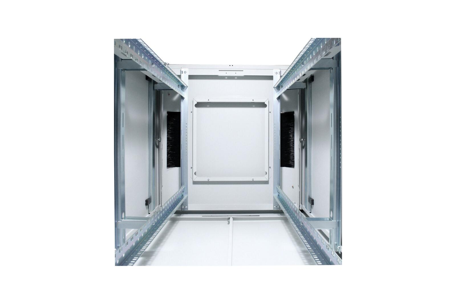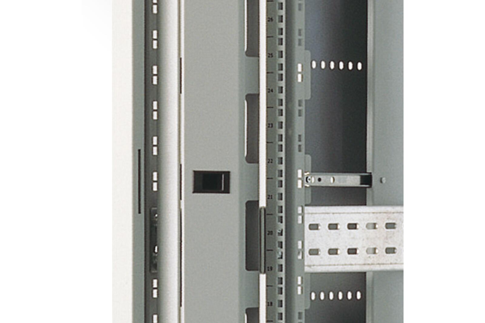 Die Netzwerkschränke der Unique Serie wurden für eine besonders komfortable und flexible Netzwerkverkabelung designt und produziert. Durchdachte Optimierungen bieten marktkonforme Stabilität bei maximaler Flexibilität. Ein modular, durch verschraubte 483 mm (19")-Blindplatten öffenbares Bodenchassis bietet ausreichend Platz für Kabel aller Art. Darüber hinaus befinden sich seitliche Kabeleinlässe mit Bürste jeweils oben und unten im Schrank, sowie ein weiterer im hinteren Bereich des Bodenchassis. Rückseitige Bürstenleisten ober- und unterhalb der Rücktür (ab 26HE), ermöglichen den Einsatz bei verschiedensten Anwendungsszenarien. Großzügige vertikale Kabelkanäle mit Kabelführungshilfen und Blende, verbaut in der Frontseite (ab 800 mm Schrankbreite), runden die vielfältigen Eigenschaften des Netzwerkschranks einwandfrei ab. Zwei Paar verkröpfte und galvanisch verzinkte, mit gegenläufig ablesbaren Höheneinheiten beschriftete 483 mm (19")-Profilschienen sind im Inneren verbaut. Sie lassen sich stufenlos verstellen und sind mit zusätzlichen Tiefenstreben im Schrank verbunden. Jeder Schrank ist eine robuste Stahlkonstruktion aus bis zu 1,5 mm starkem Stahlblech. Die Farbgebung erfolgt in Form von elektrostatischer Pulverbeschichtung in den Standardfarben Grau (RAL 7035) und Schwarz (RAL 9005). Modular abschließ- und abnehmbare Seitenwände sowie Türen verbessern die Zugänglichkeit. Ein Türanschlagswechsel kann vorgenommen werden. Des Weiteren sind die Schränke auf Grund der zerlegbaren Konstruktion bei Bedarf komplett demontierbar.