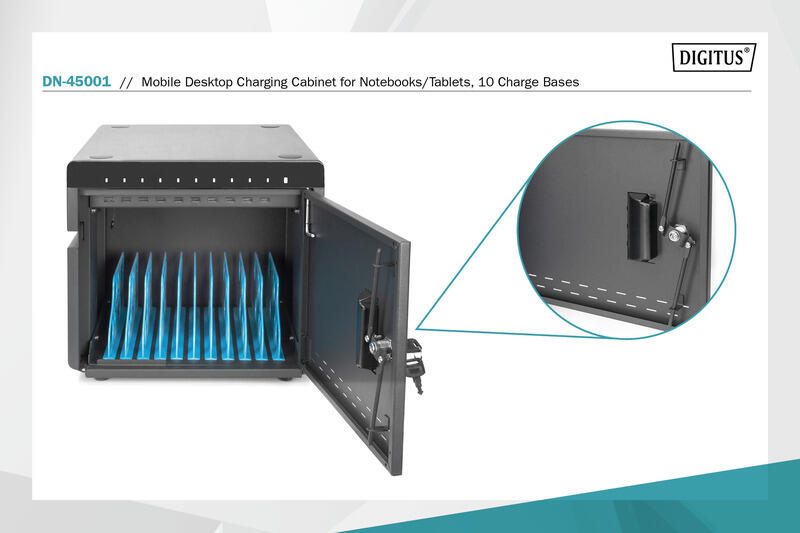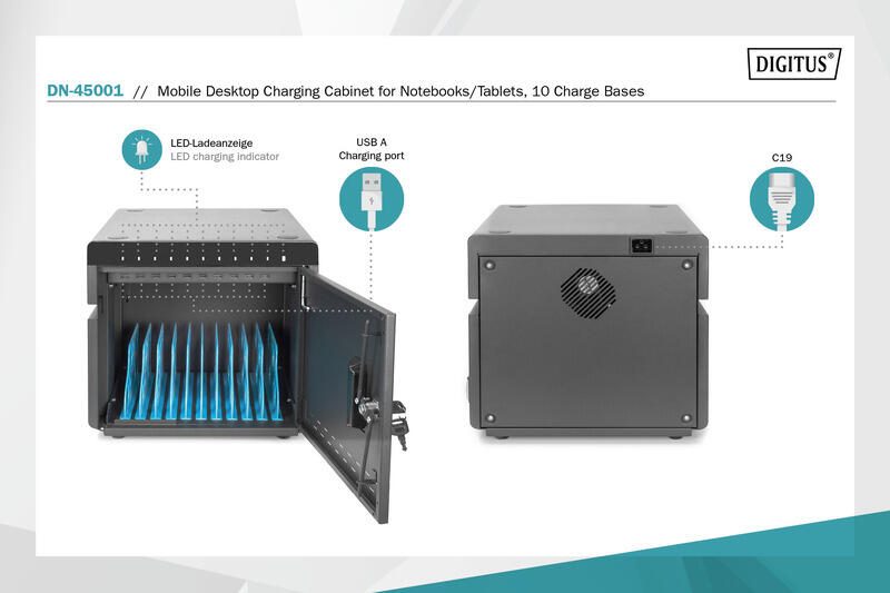 Der mobile Ladeschrank von DIGITUS® ist die ideale und kompakte Lösung zur Aufbewahrung und zum Aufladen Ihrer portablen Geräte, wie z. B. Notebooks und Tablets. Häufig werden mobile Ladeschränke in öffentlichen Einrichtungen wie z. B. Schulen genutzt, um die Geräte an einem zentralen Ort gesichert aufzubewahren und gleichzeitig laden zu können. Der Schrank beeinhaltet 10 Ladeplätze, von dem jeder über einen eigenen USB-Anschluss an der Vorderseite verfügt. Dank integrierter LED-Indikatoren haben Sie jederzeit den Ladevorgang im Blick (Rot: Ladevorgang; Grün: Ladevorgang beendet/kein Gerät angeschlossen). Abriebfeste Standfüße sorgen für einen rutschfreien Aufbau. Ein verbauter Lüfter in Verbindung mit Lüftungsschlitzen sorgt für eine aktive Entwärmung des Schrankes.