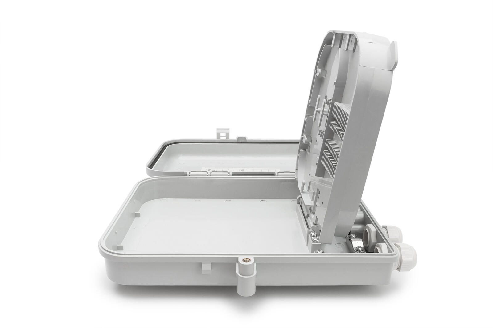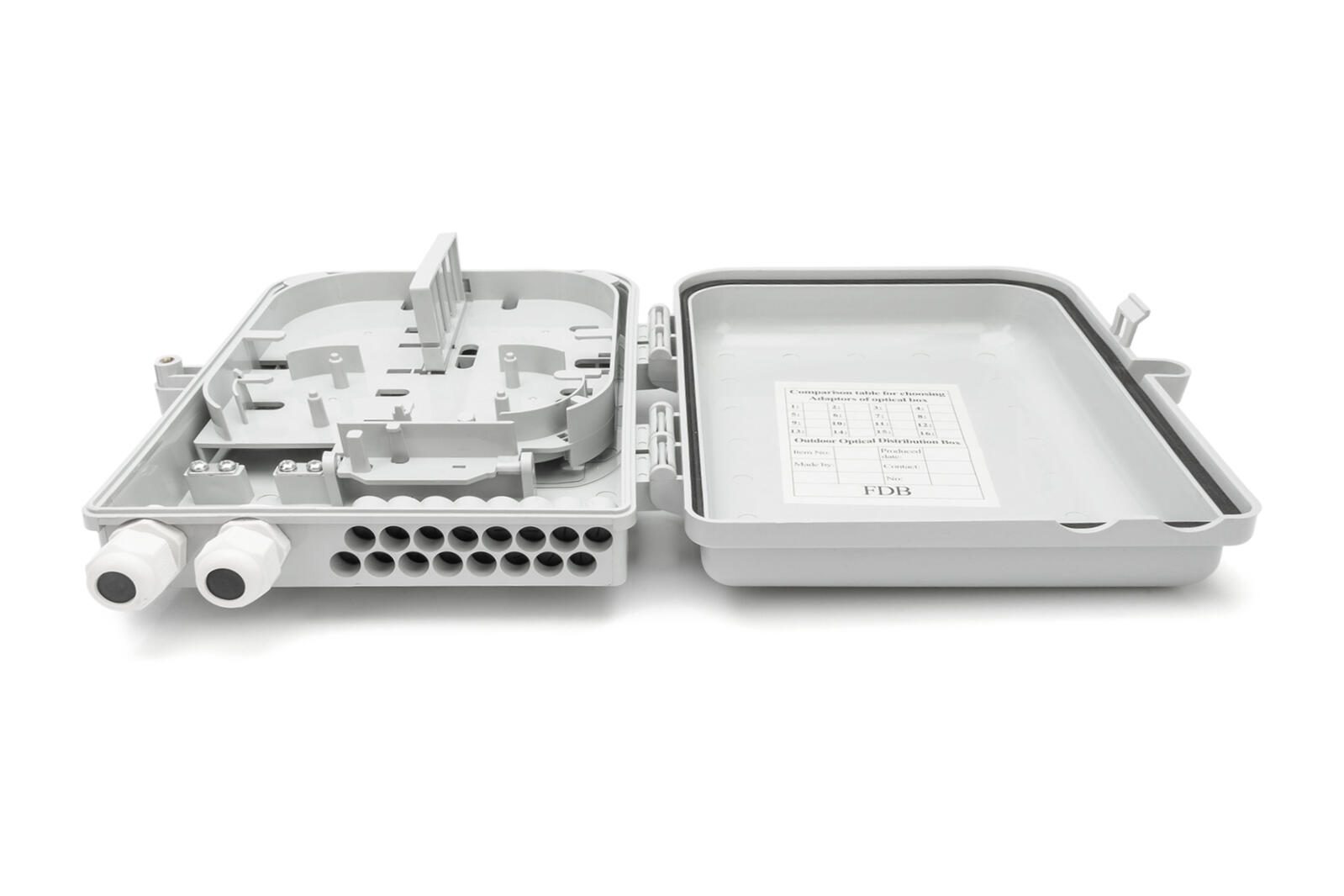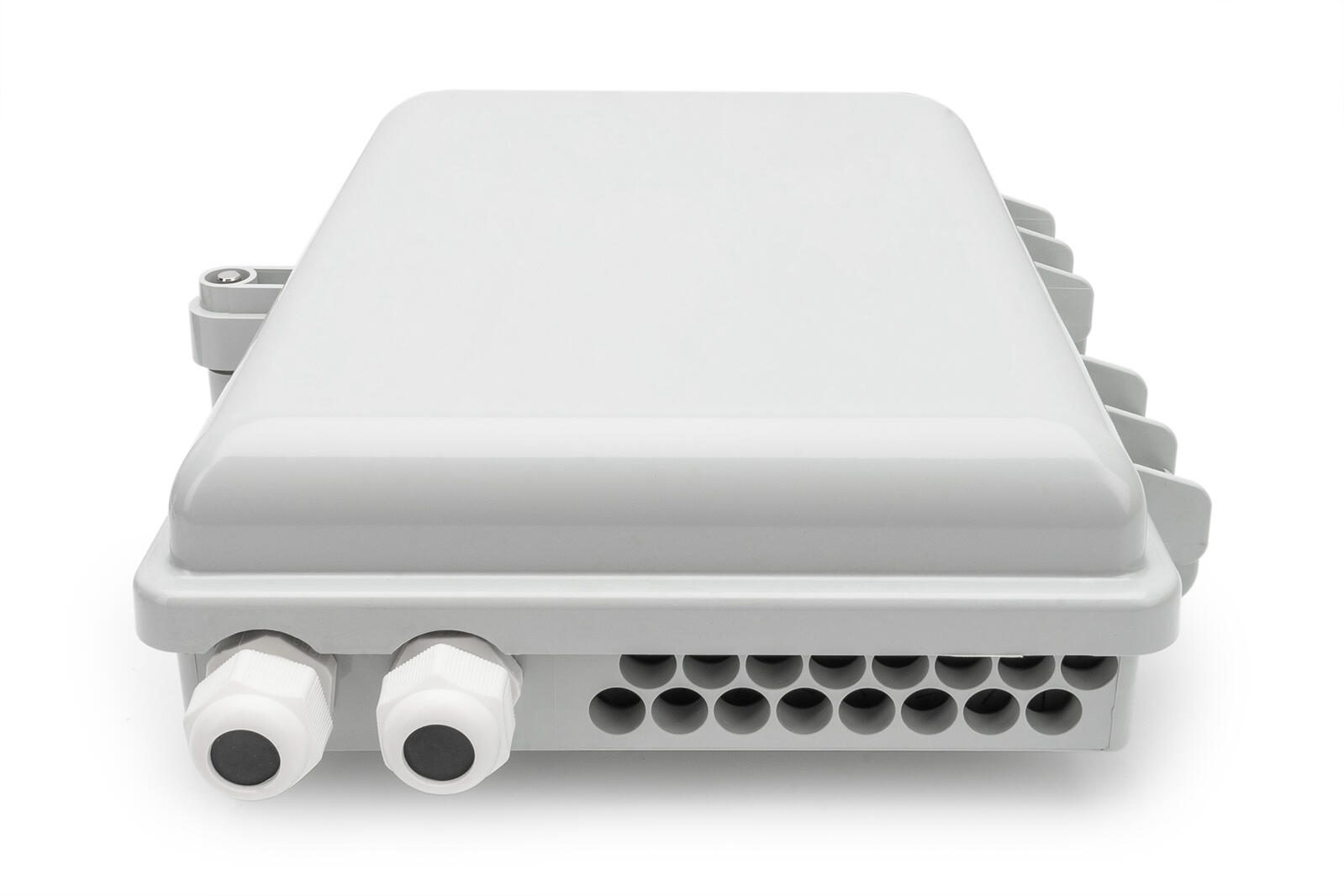 Die FTTH Box ist geeignet für die Außenmontage. Zur Glasfaserverteilung dient eine Halterung im Inneren für 16x LC (DX) bzw. SC (SX) Kupplungen. Eine Überlängenablage für Pigtails sowie verschiedene Kabeleinlässe sorgen für bestmögliche Verkabelungsmöglichkeiten.