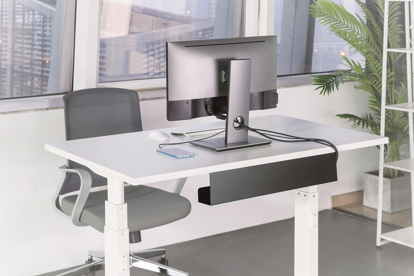 DA-90448 ist eine einfache Lösung, um Kabel/Steckdosenleisten unter dem Schreibtisch zu verbergen. Sie wurde entwickelt, um das Kabelmanagement diskret und einfach zu halten. Der Kanal kann sowohl am Sitz-Steh-Schreibtisch als auch an einem herkömmlichen Schreibtisch befestigt werden. Es wird ausreichend Platz für Stromleitungen, Netzwerk- und Computerkabel geschaffen. Das Kabelmanagement ermöglicht die Bewegung des Steh-Sitz-Schreibtisches und verhindert gleichzeitig eine Beschädigung der Verkabelung. Das schlichte Erscheinungsbild passt perfekt zu einer klaren, offenen Gestaltung Ihres Arbeitsplatzes.