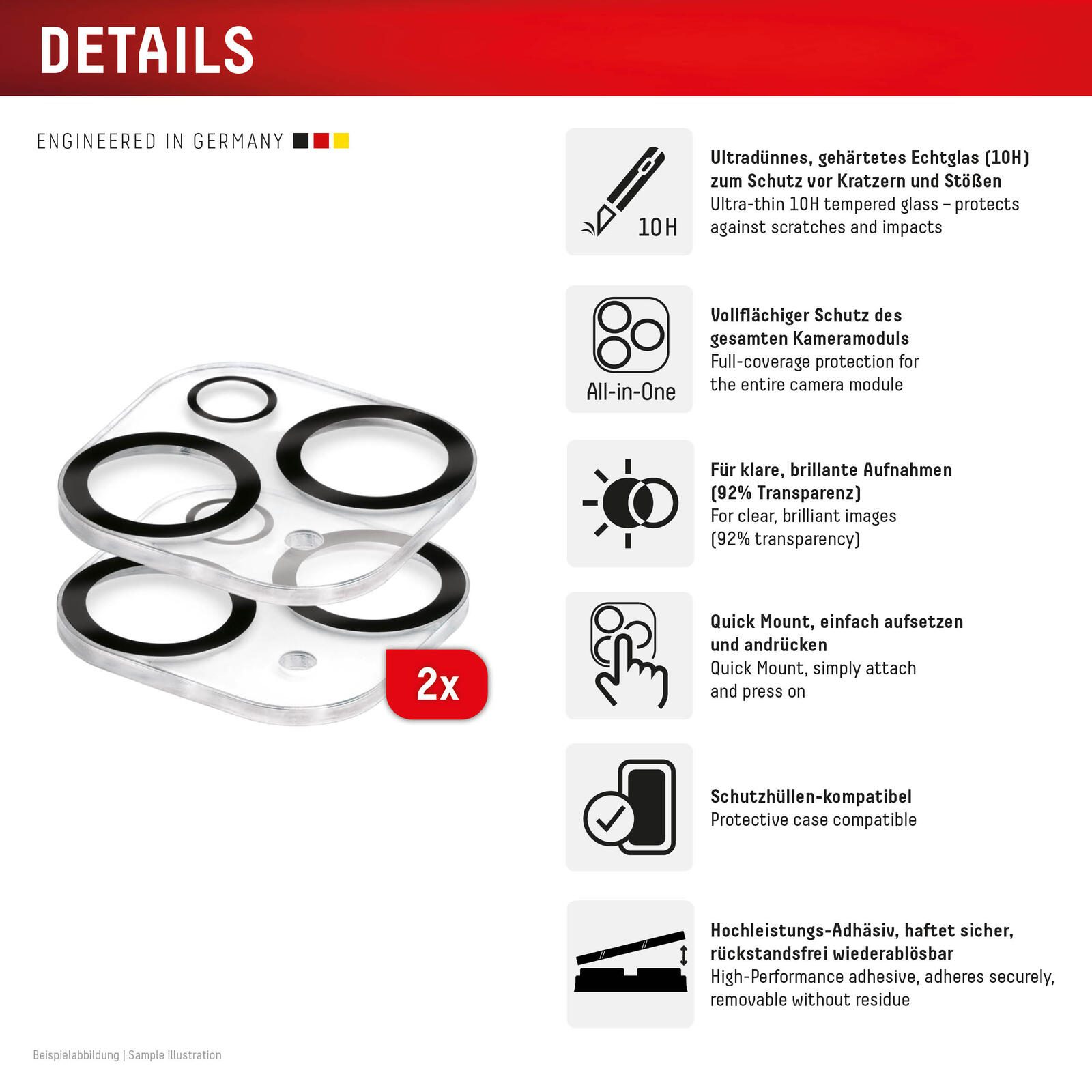 - All-in-One Glasabdeckung für das gesamte Kameramodul: Vollflächige Abdeckung aller Kameralinsen – einheitlich, elegant, sicher.