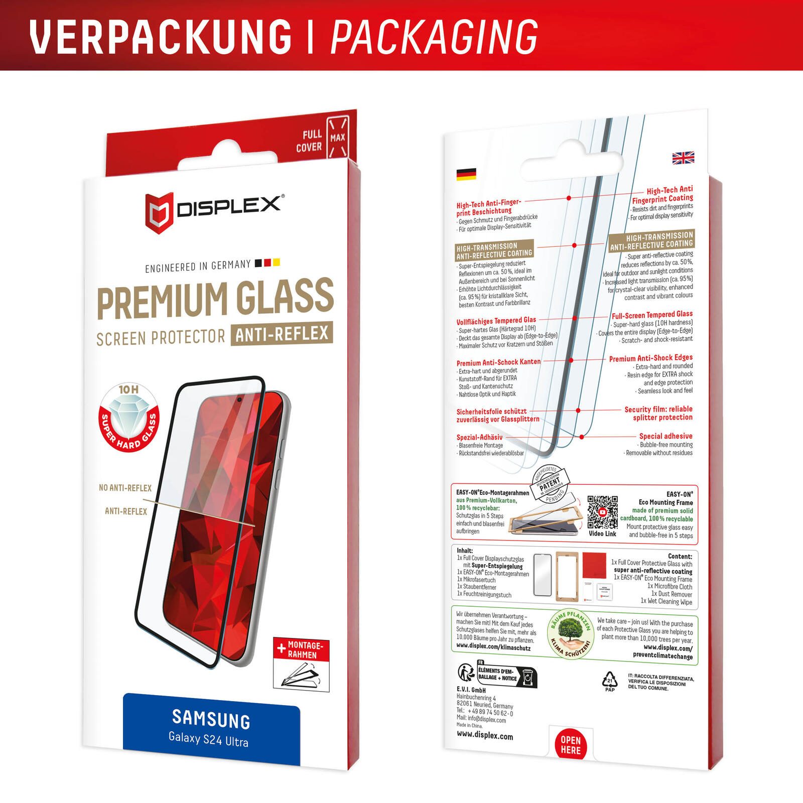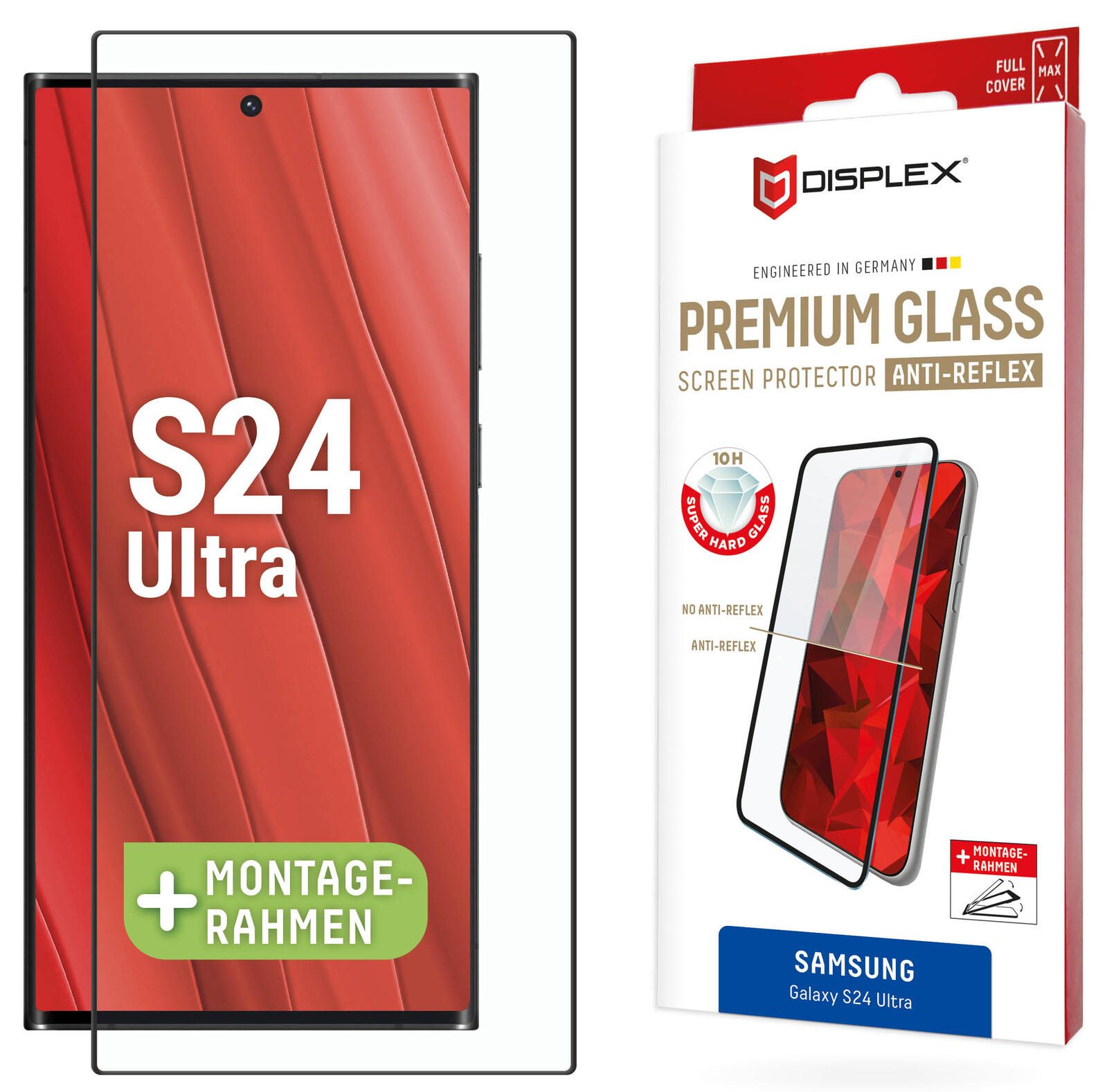 DISPLEX Premium Anti-Reflex Panzerglas (super-entspiegelt, FC, 10H) für Samsung Galaxy S24 Ultra Eco-Montagerahmen, volle Displayabdeckung, Tempered Glas, kratzer-resistente Schutzfolie