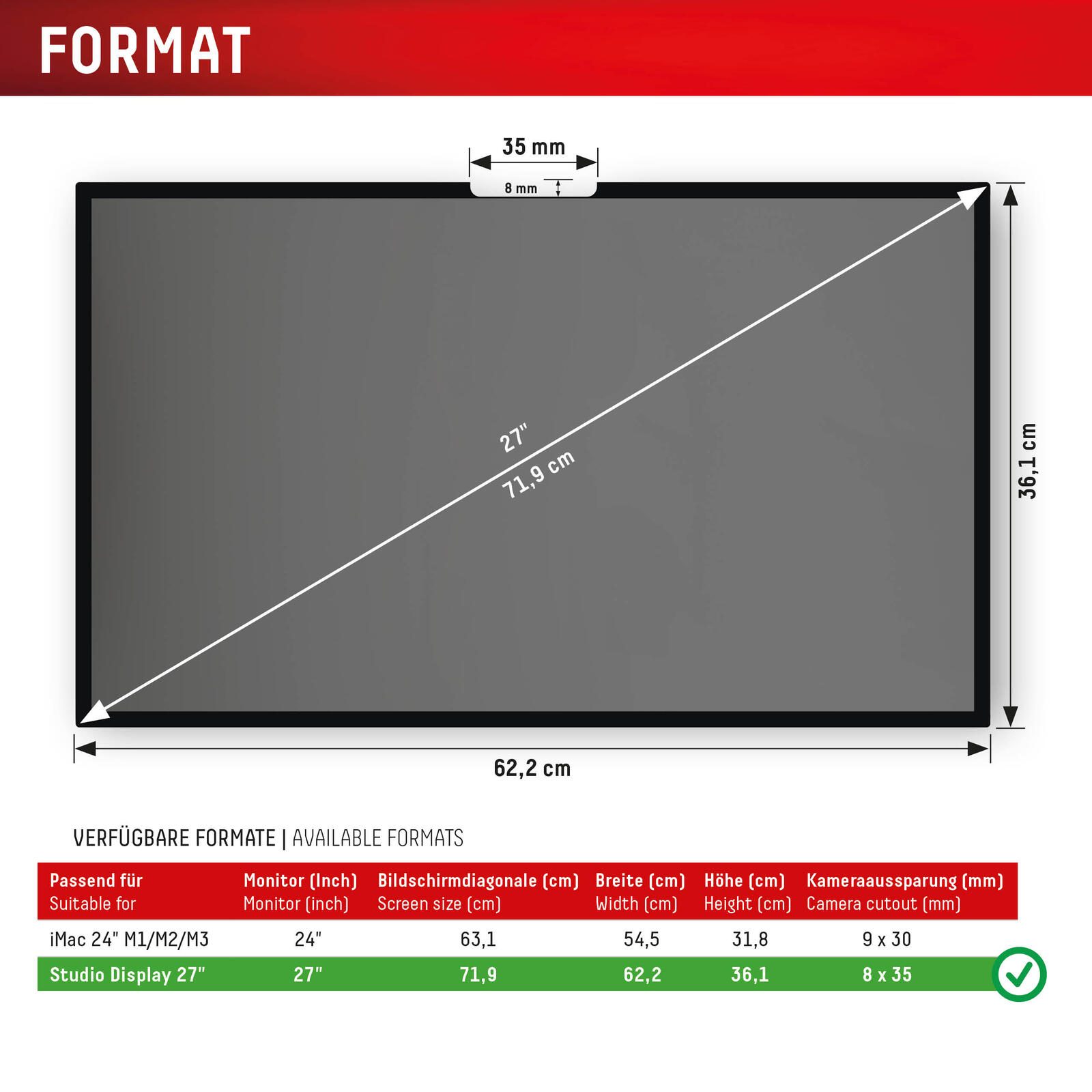 - Für Studio Display 27", BxH: 62,2 x 36,1 cm, Diagonale: 71,9