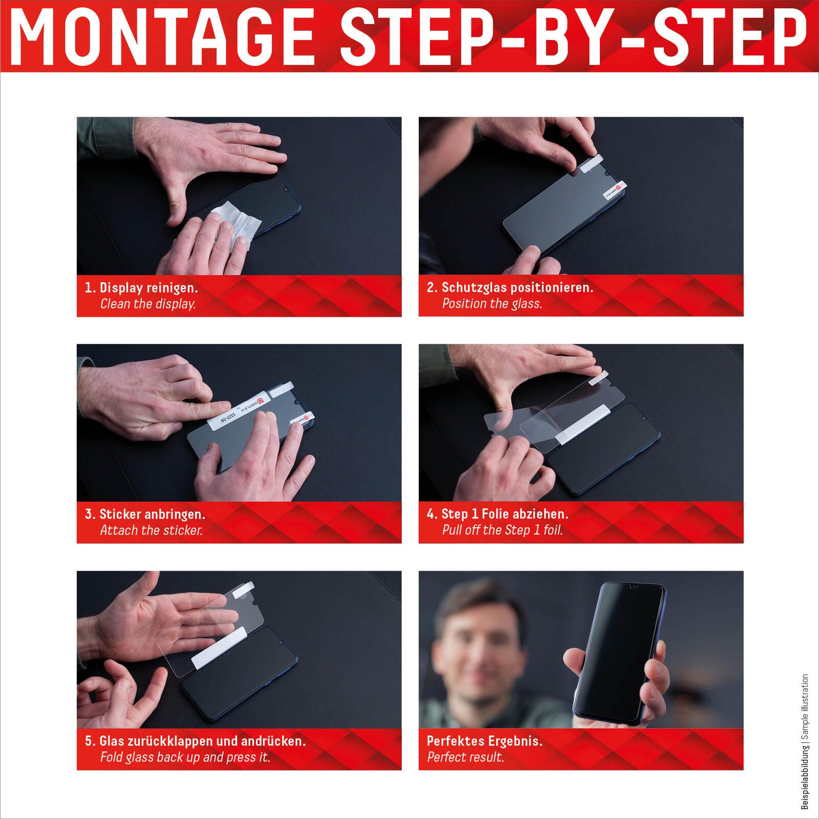 Mit den EASY-ON® Montagestickern und dem dazugehörigen Video Tutorial gestaltet sich die Montage des Smart Glass ungemein schnell, einfach und exakt. Das Ergebnis: kein schiefes Aufliegen des Schutzfolie auf dem Display, keine verdeckten Öffnungen für Lautsprecher oder Mikrofone und erst recht keine Blasen unter der Displayfolie.