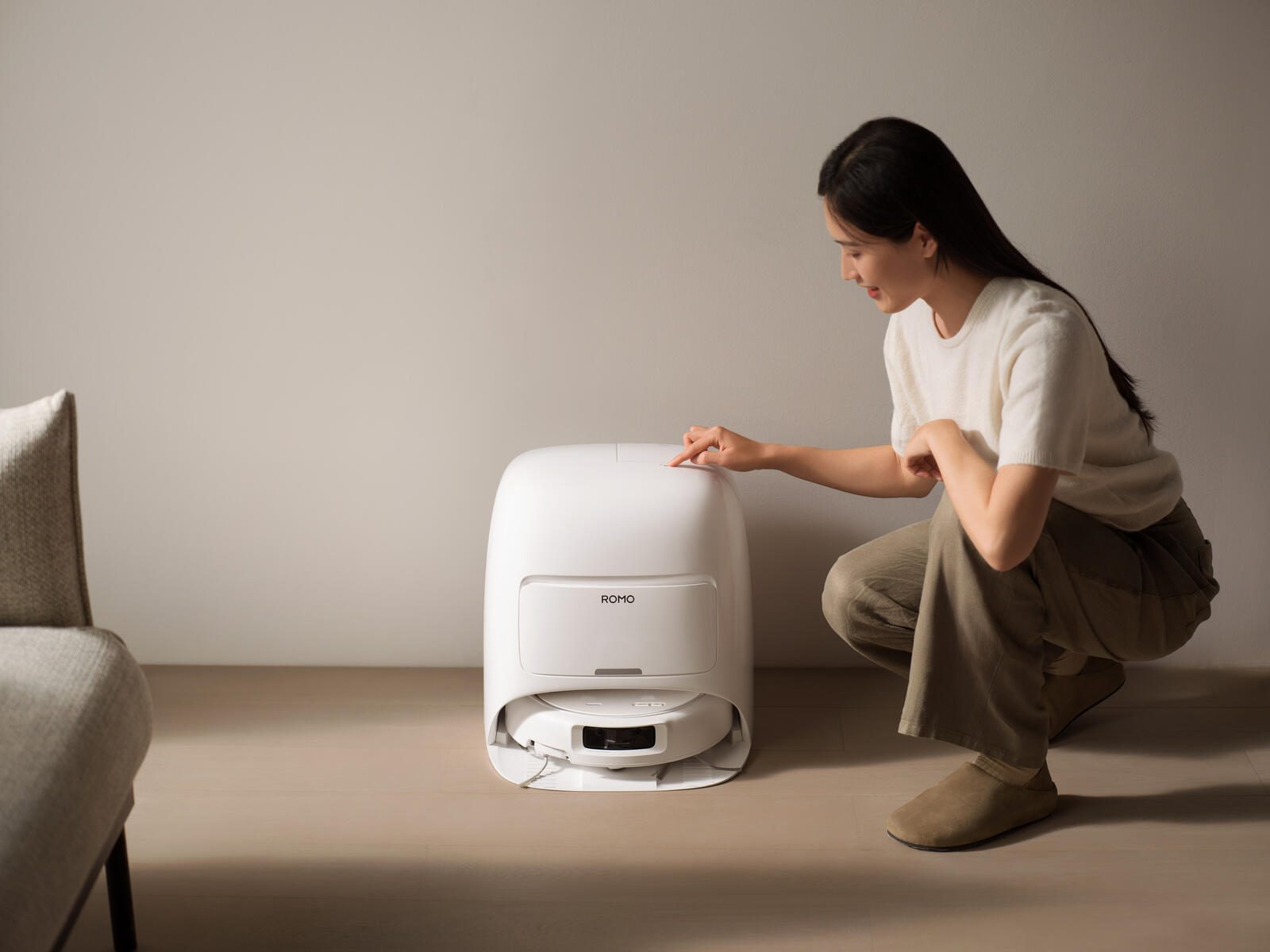 Dank Echtzeitkartierung und adaptiver Kantenerkennung klappen die dual-flexiblen ROMO Arme automatisch aus und ein, um in jeden Raum zu passen. Sie fahren zudem tief in Ecken und an Kanten entlang, um auch Schmutz an Wänden oder Tischbeinen zuverlässig zu entfernen.