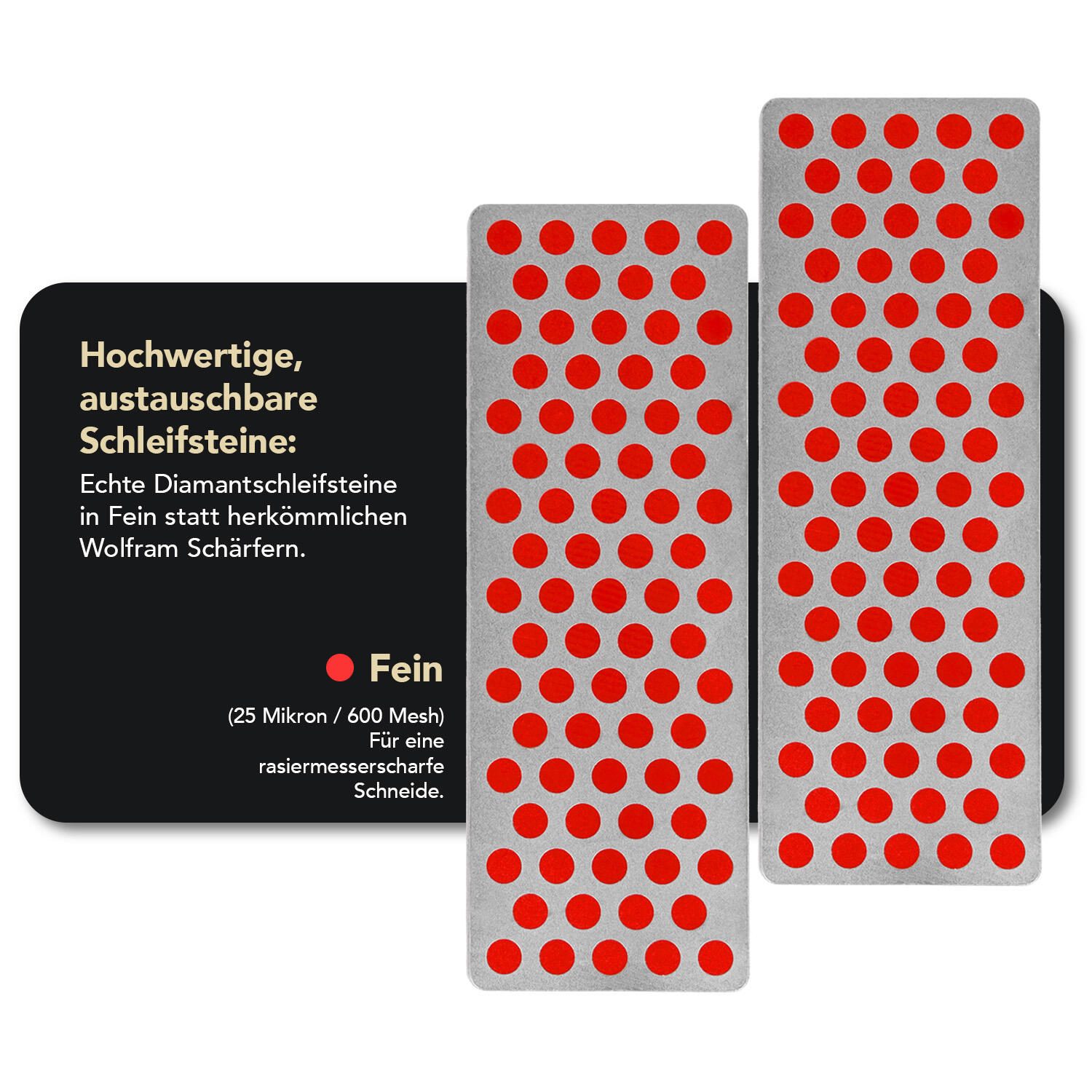 Die diamantbeschichtete Schleiffläche garantiert eine effektive und präzise Schärfung Ihrer Messer. Diamant als Schleifmittel bietet den Vorteil, dass es besonders hart und langlebig ist, wodurch der Schärfer auch nach vielfachem Gebrauch seine Leistung behält. Dies ermöglicht es Ihnen, stumpfe Klingen schnell und mühelos wieder in einen scharfen Zustand zu versetzen, was die Schneidqualität und Sicherheit beim Gebrauch Ihrer Messer erhöht.