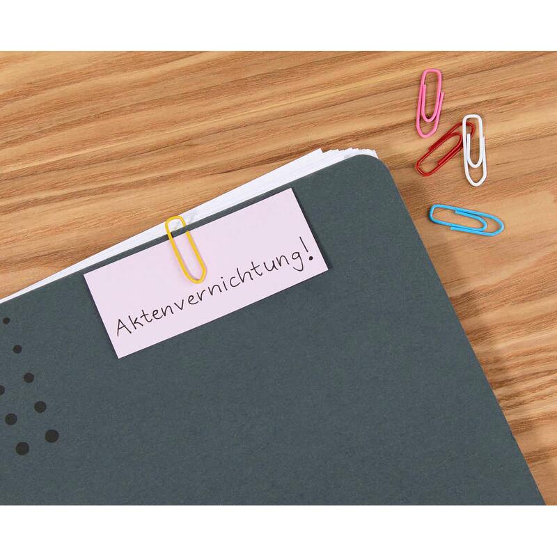 Die Büroklammern bestehen aus Metall und sind kunststoffüberzogen, wodurch sie nicht nur farbenfroh, sondern auch schonend für Ihre Papiere sind. Die spitze Form gewährleistet ein leichtes Einführen und sicheren Halt, ohne das Papier zu beschädigen. Dank der farbsortierten Auswahl bringen sie zudem etwas Farbe und Übersicht in Ihre Unterlagen, was besonders bei der Organisation und beim Sortieren von Dokumenten von Vorteil ist.