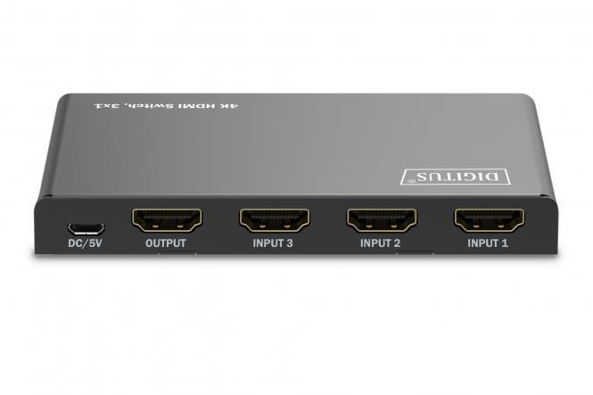 Der DIGITUS® 4K HDMI Switch, 3x1 bietet zusätzliche HDMI-Anschlüsse für Ihr Ausgabedisplay - 3 Signalquellen lassen über nur 1 HDMI Anschluss am Bildschirm anbinden. Der Video-Umschalter wird mittels Micro USB Kabel mit Strom versorgt z.B. über das Quell-Gerät oder einen USB-Ladeadapter. Wechseln Sie bequem zwischen den Signalquellen via Fernbedienung, am Gerät selbst oder via automatischer Erkennung. Perfekt geeignet bei Wandmontage des TVs - nur ein HDMI-Kabel zum Anschluss der Quellen erforderlich.