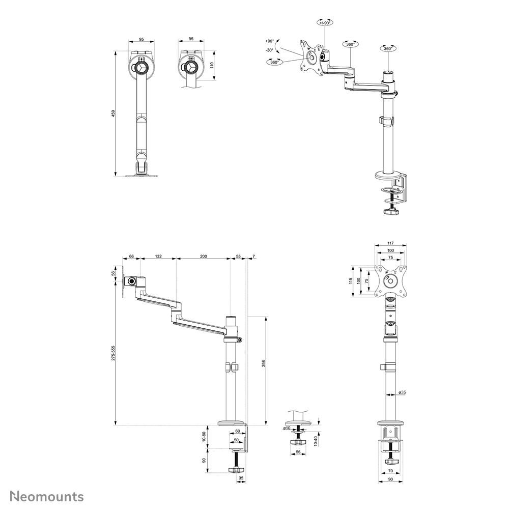 Dank des kurzen T-Rex®-Oberarms des NEXT Lite ist nur eine minimale Tiefe erforderlich, wenn die Halterung in der Nähe einer Wand oder Trennwand aufgestellt wird. Dadurch kann der Bildschirm weiter vom Benutzer entfernt aufgestellt werden, was besser für die Augen ist und mehr Raum für eine gute ergonomische Arbeitshaltung lässt. Das intelligente interne Kabelmanagementsystem sorgt für eine übersichtliche Kabelführung. Der DS60-425WH1 ist für Bildschirme mit einem VESA-Lochbild von 75x75 oder 100x100 mm geeignet. Neomounts bietet mehrere optionale VESA-Adapterplatten für verschiedene Lochmuster an. Der DS60-425WH1 verfügt über ein Easy-Release-VESA-System für eine einfache Installation und wird mit einer Tischklemme und einer Öse geliefert.