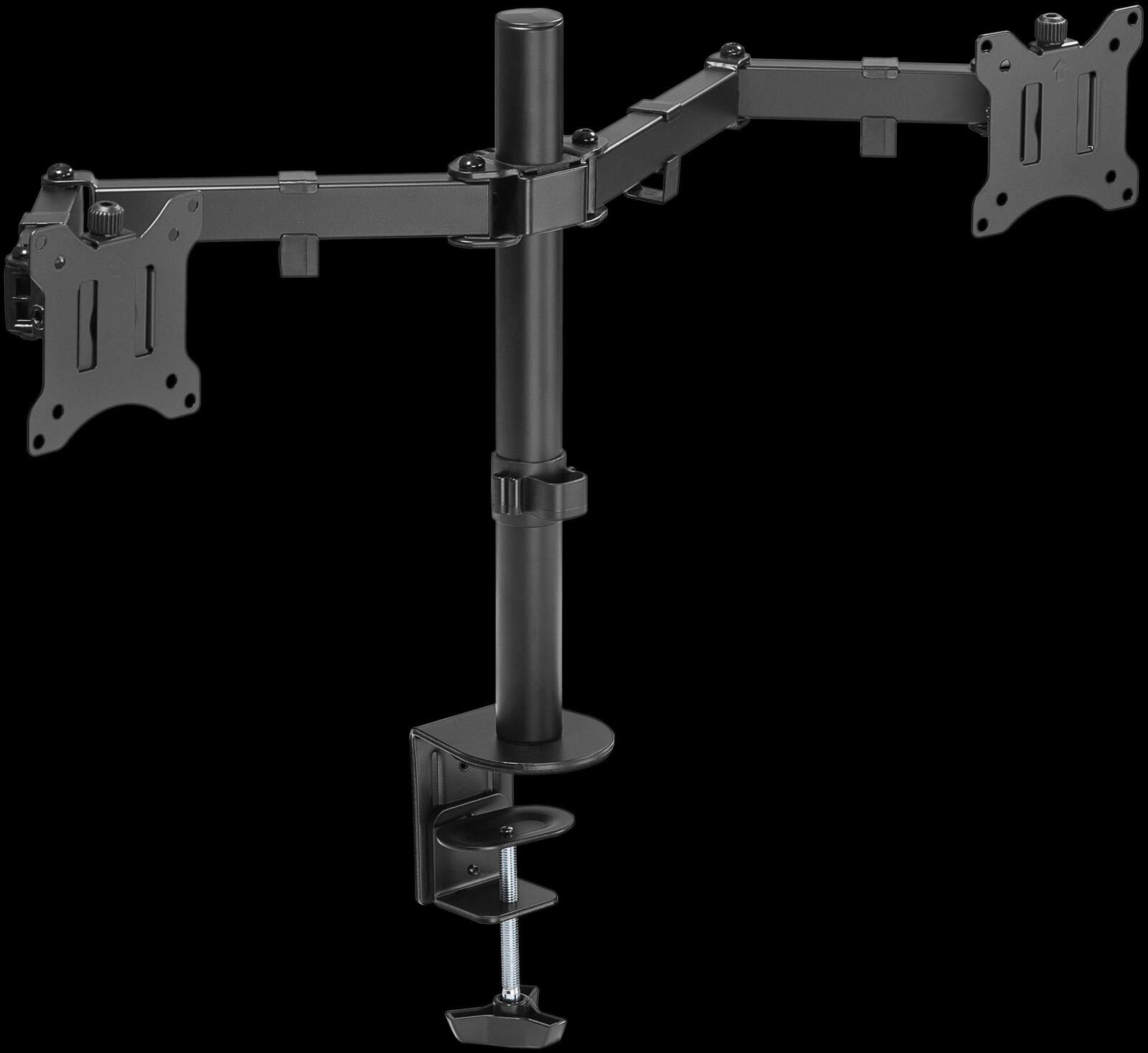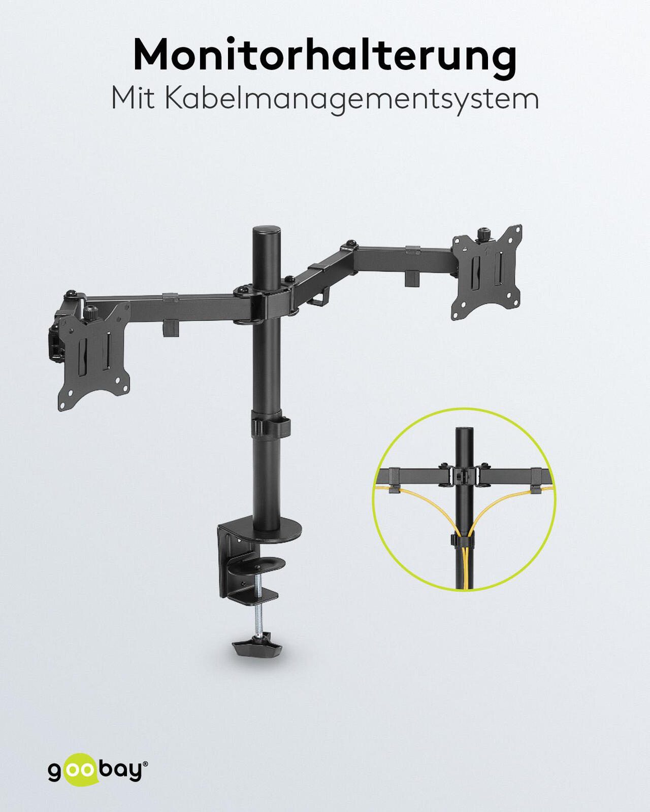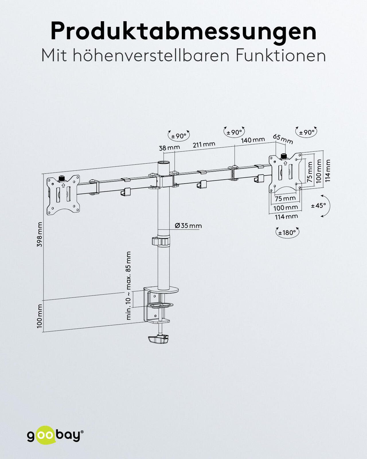 Die goobay Monitor-Halterung Dual Flex in elegantem Schwarz ist die ideale Lösung für alle, die ihre Arbeitsumgebung optimieren möchten. Hergestellt aus robustem Stahl bietet diese Halterung nicht nur Stabilität, sondern auch eine lange Lebensdauer. Mit einer VESA-Platte von 1,5 mm Stärke ist sie besonders widerstandsfähig und sorgt dafür, dass Ihre Monitore sicher und fest an ihrem Platz bleiben. Diese Halterung ist speziell für die Verwendung von zwei Monitoren konzipiert, was Ihnen ermöglicht, Ihre Produktivität erheblich zu steigern. Egal, ob Sie im Homeoffice arbeiten, kreative Projekte umsetzen oder einfach nur mehr Bildschirmfläche für Multitasking benötigen, die Dual Flex Halterung wird Ihren Anforderungen gerecht. Durch die Tischklemme lässt sich die Halterung einfach und schnell an jedem Tisch oder Schreibtisch montieren, ohne dabei die Oberfläche zu beschädigen. Die schwarze Farbgebung der Halterung fügt sich harmonisch in jede Büroeinrichtung ein und sorgt für einen modernen Look. Darüber hinaus ermöglicht die flexible Konstruktion eine individuelle Anpassung der Monitore, sodass Sie stets die optimale Sicht auf Ihre Inhalte haben. Durch die Möglichkeit, die Monitore in der Höhe und im Winkel zu verstellen, können Sie eine ergonomische Arbeitsposition einnehmen, die Nacken- und Rückenschmerzen vorbeugt. Die goobay Monitor-Halterung Dual Flex ist nicht nur funktional, sondern auch eine stilvolle Ergänzung für Ihr Büro oder Ihren Arbeitsplatz. Mit dieser Halterung profitieren Sie von einer verbesserten Arbeitsorganisation und einem aufgeräumten Schreibtisch, da Kabel und Monitore effizient verwaltet werden können. Verleihen Sie Ihrem Arbeitsbereich mit dieser praktischen und eleganten Lösung den letzten Schliff.Technische Daten